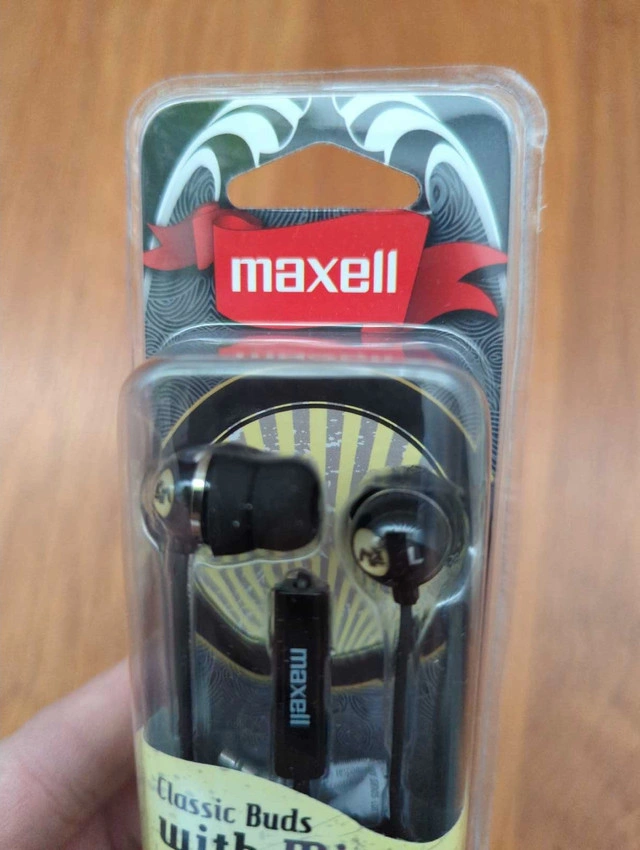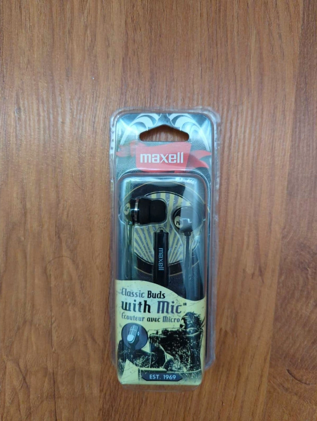 Get ready to groove with these brand new Maxell Classic Buds with Mic, offering a vintage aesthetic with modern functionality. These earbuds are perfect for enjoying your favourite tunes on the go, complete with a built-in microphone for calls and voice commands! These are new, never opened, still in the original packaging. Of course, since this ad is live, the Maxell Classic Buds with Mic are available!