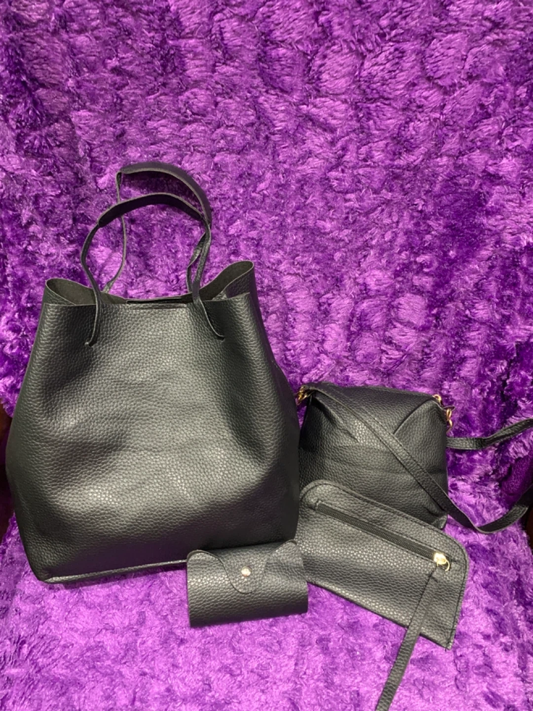 Selling a stylish 4-piece handbag set in black faux leather! This set includes a tote bag, a crossbody bag, a small wallet, and a zippered pouch. Perfect for keeping all your essentials organized and looking chic!