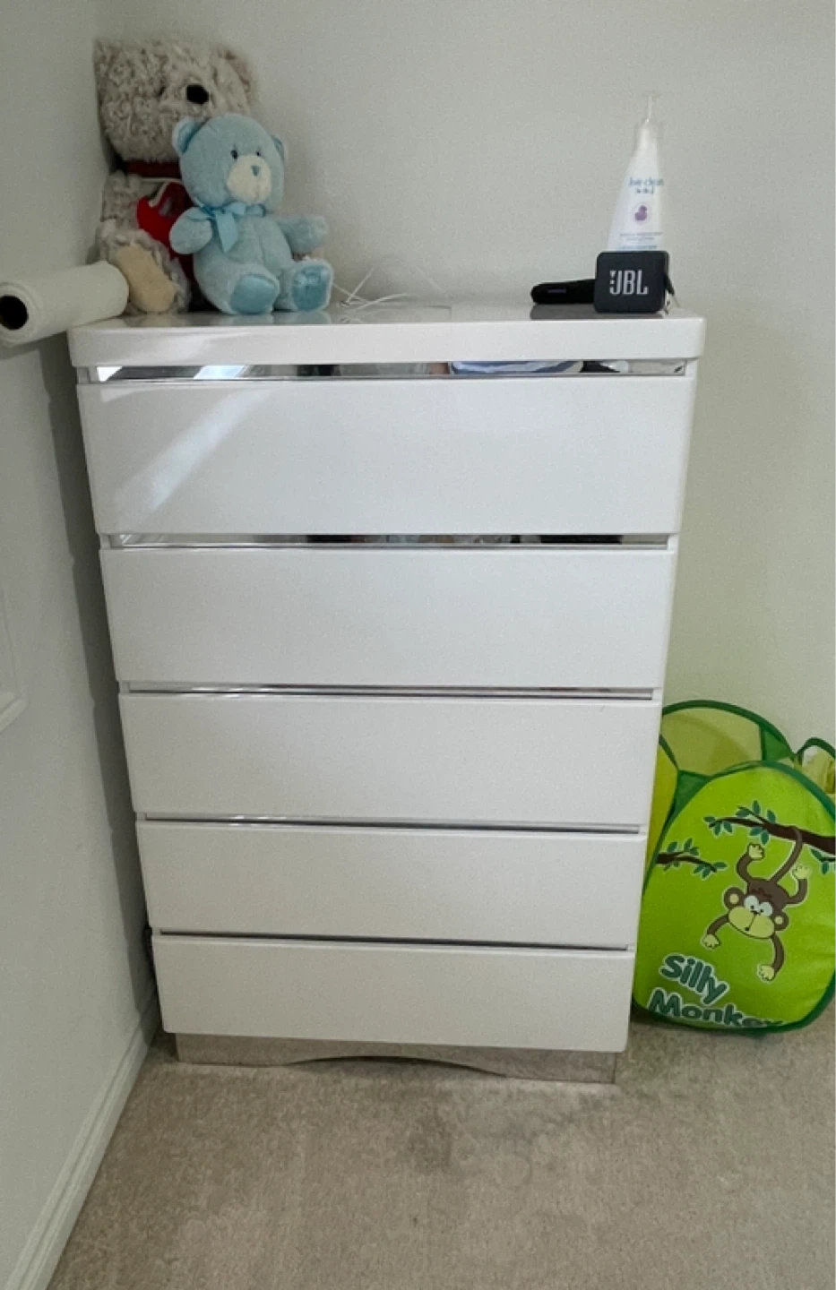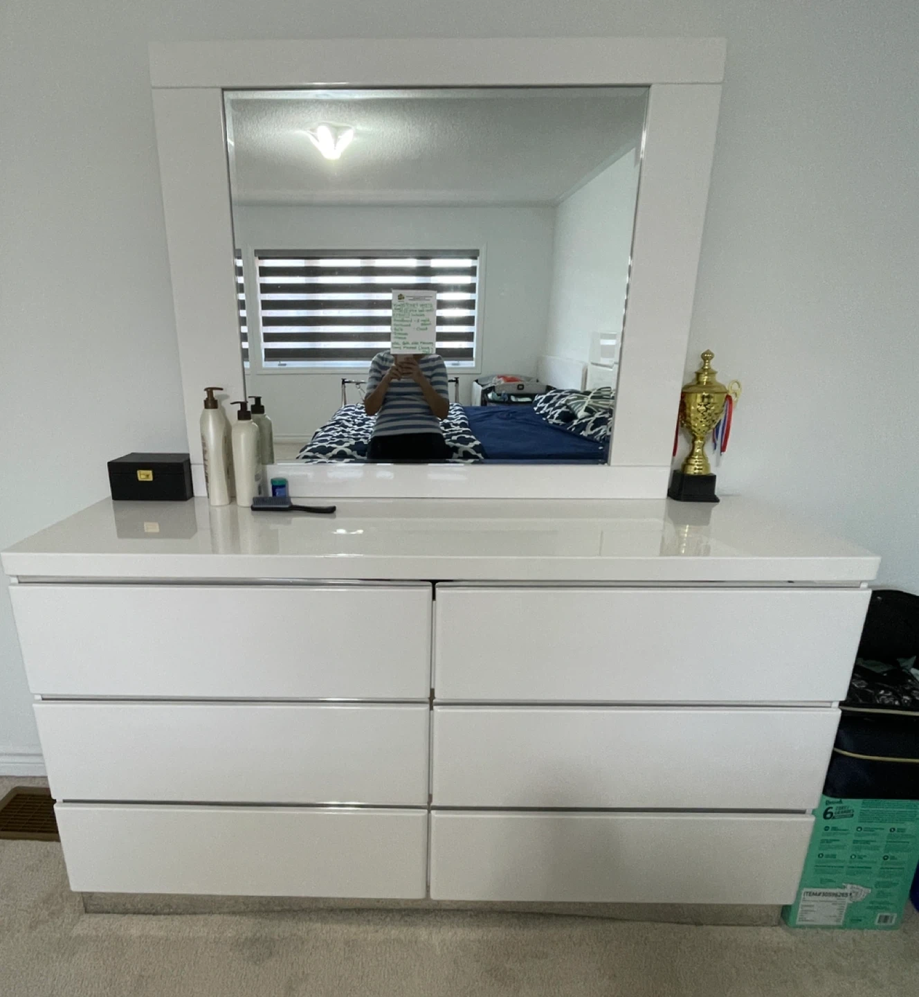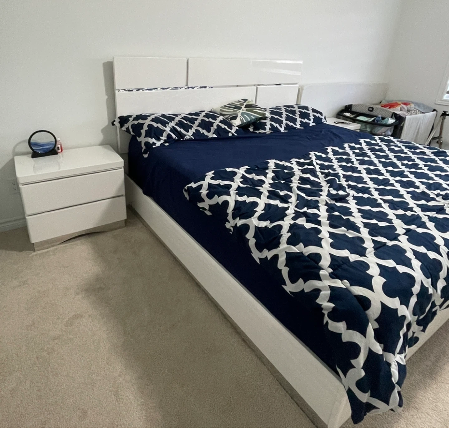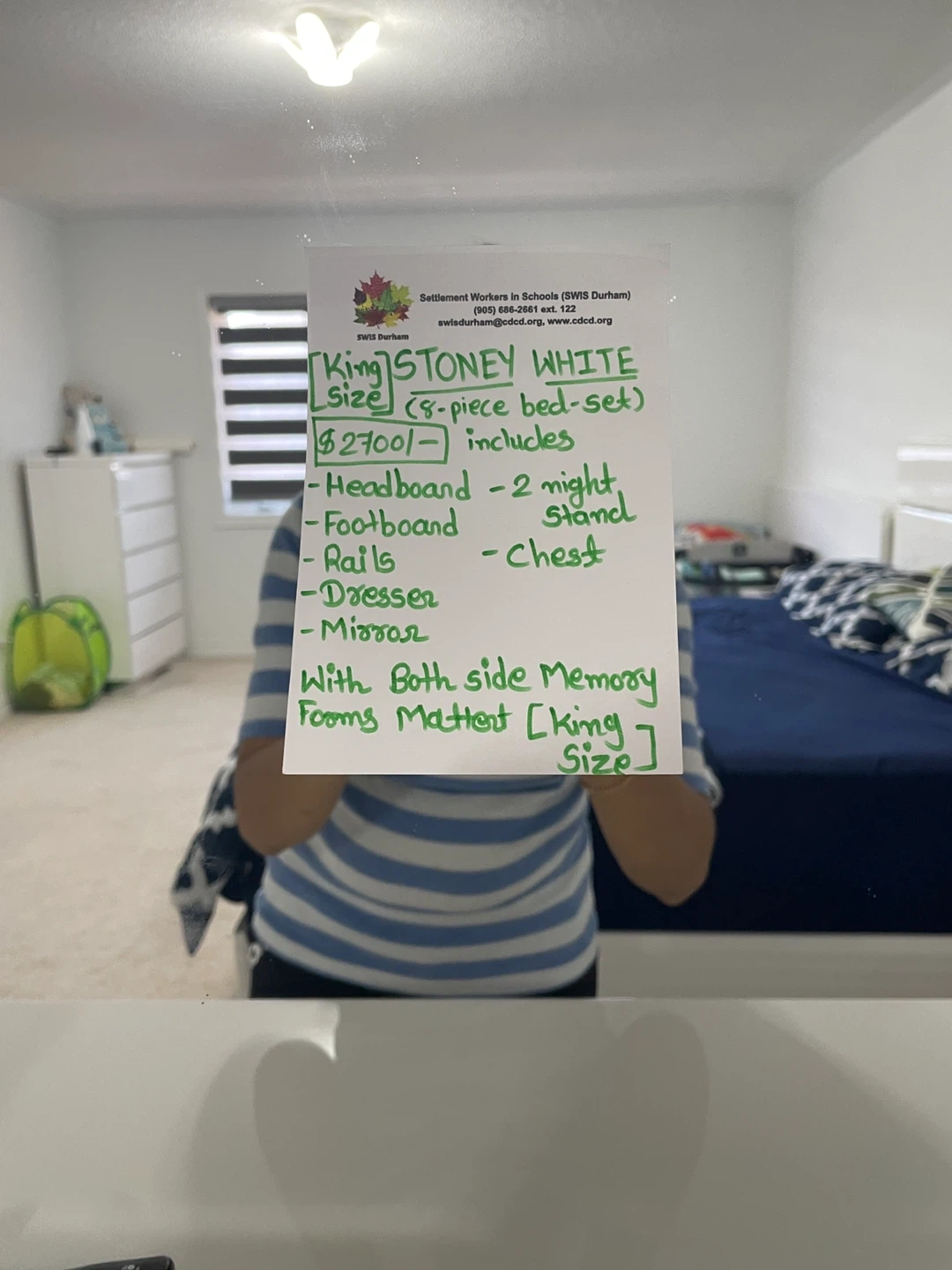 5Selling a Stoney White king size bedroom set. The set includes a headboard, footboard, rails, two nightstands, a chest, a dresser, and a mirror. It also comes with a king size memory foam mattress for both sides. Originally bought for $3200 + $900 for mattress Moving out sell