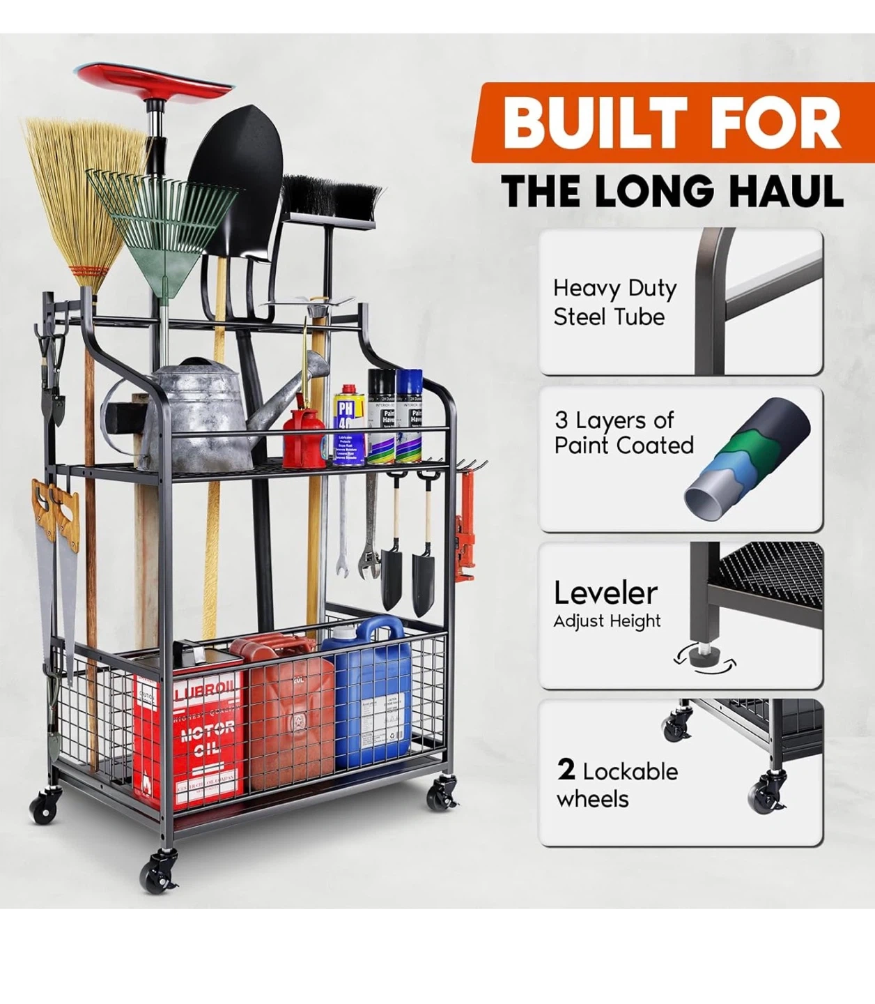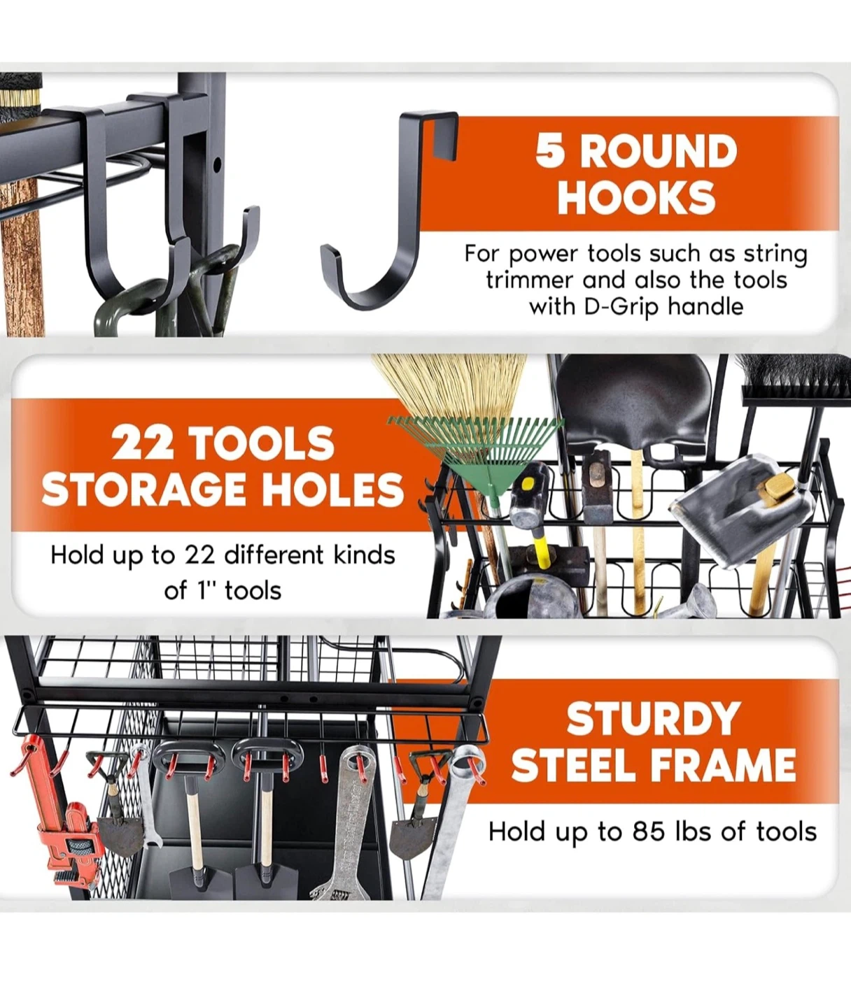 - Sturdy steel frame that holds up to 85 lbs of tools