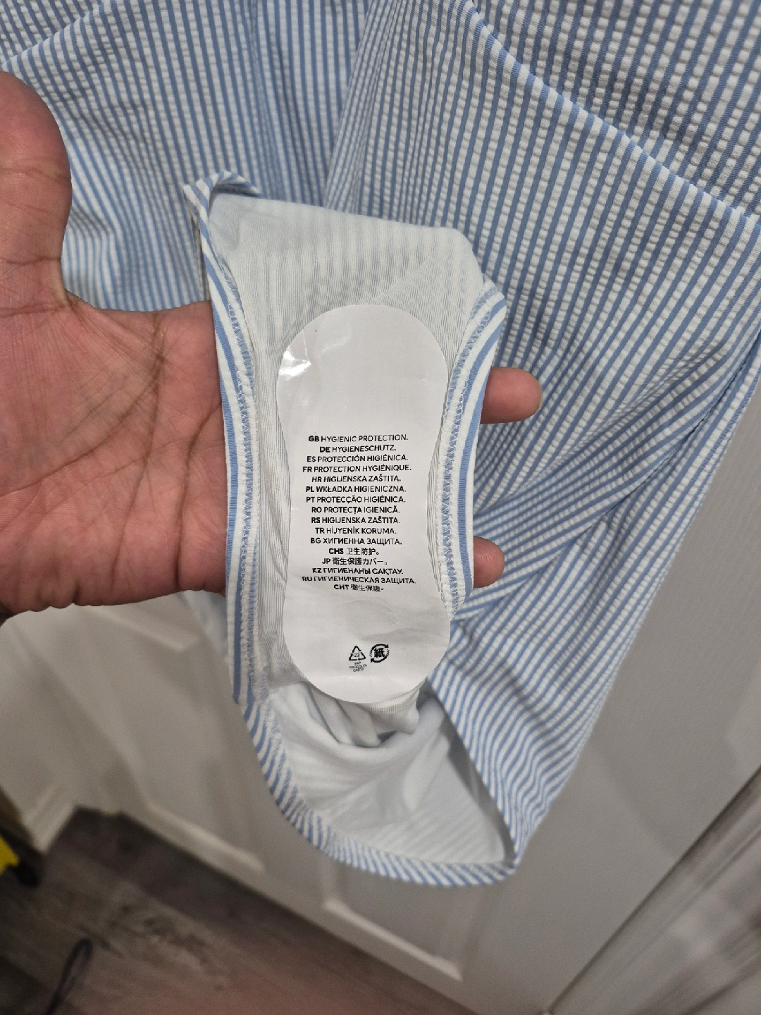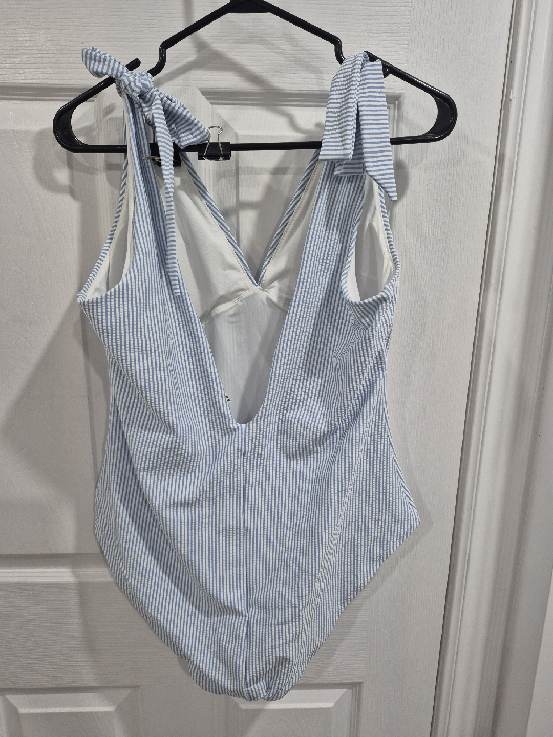 Selling a cute striped one-piece swimsuit. It's in great condition and ready for the summer! The stripes are a nice light blue and white, perfect for the beach or the pool.