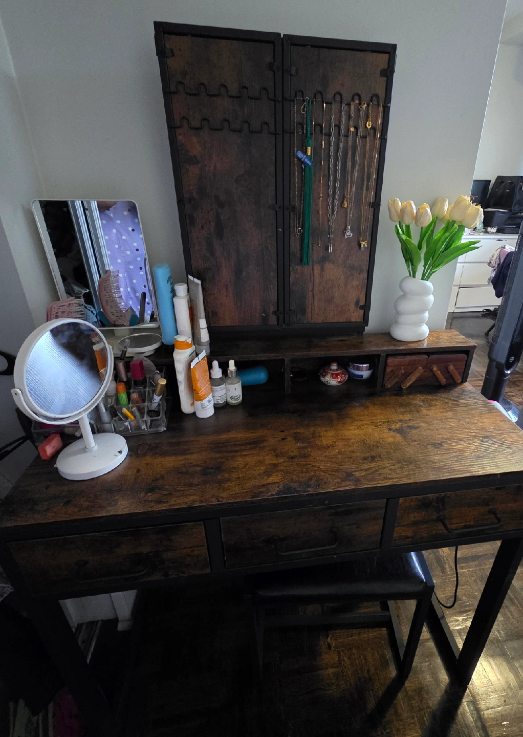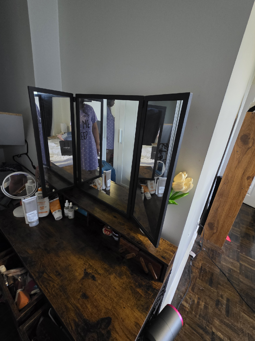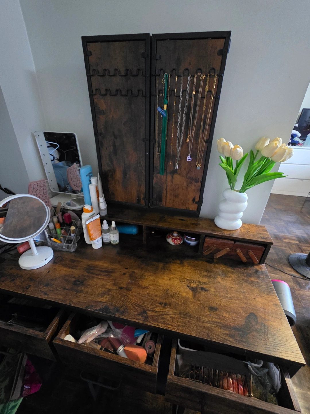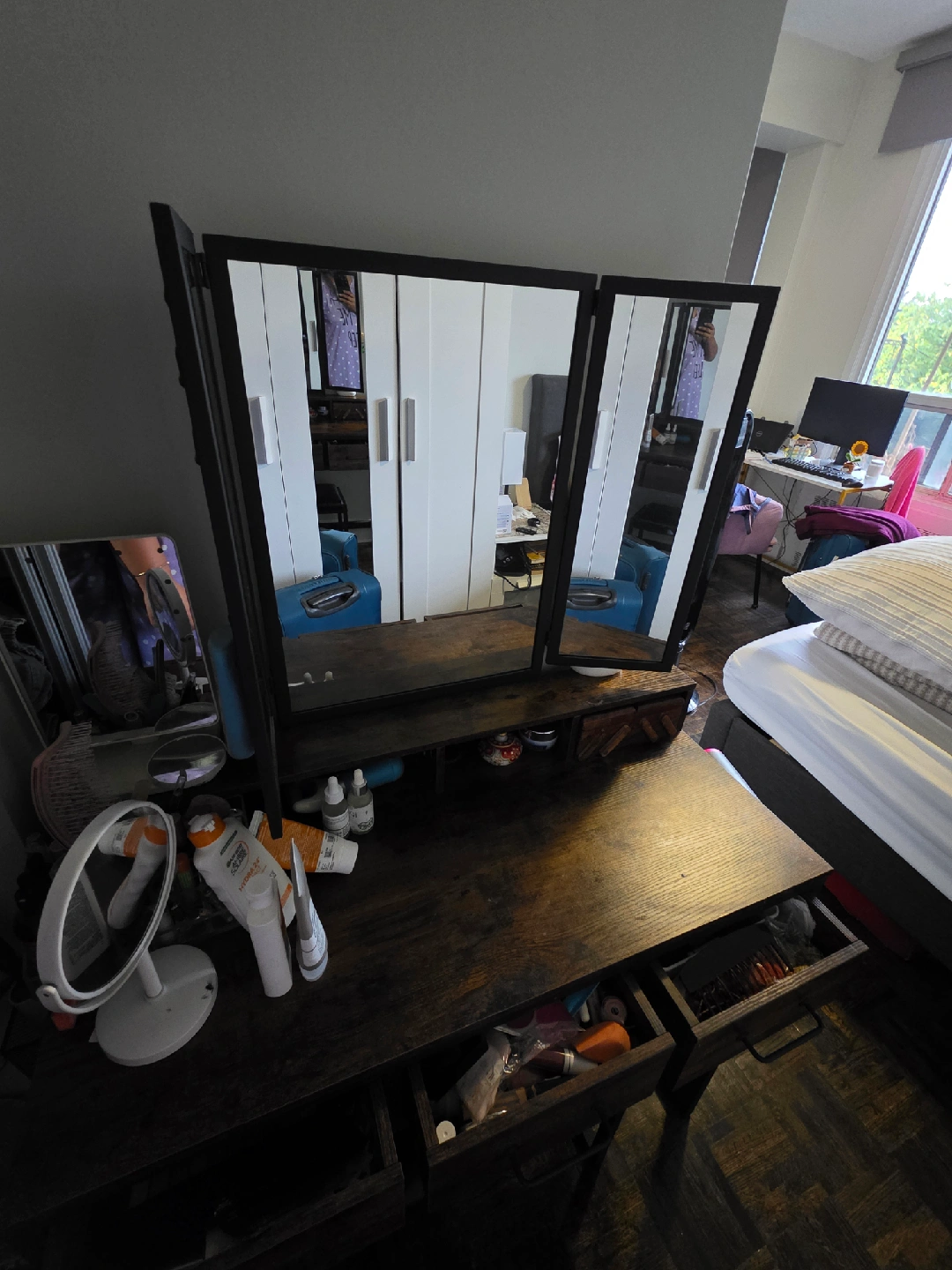 Selling a VASAGLE vanity set with a tri-fold mirror! It features a rustic brown and black industrial style. It also includes 3 drawers and a brush holder. Perfect for adding a touch of vintage charm to your space!