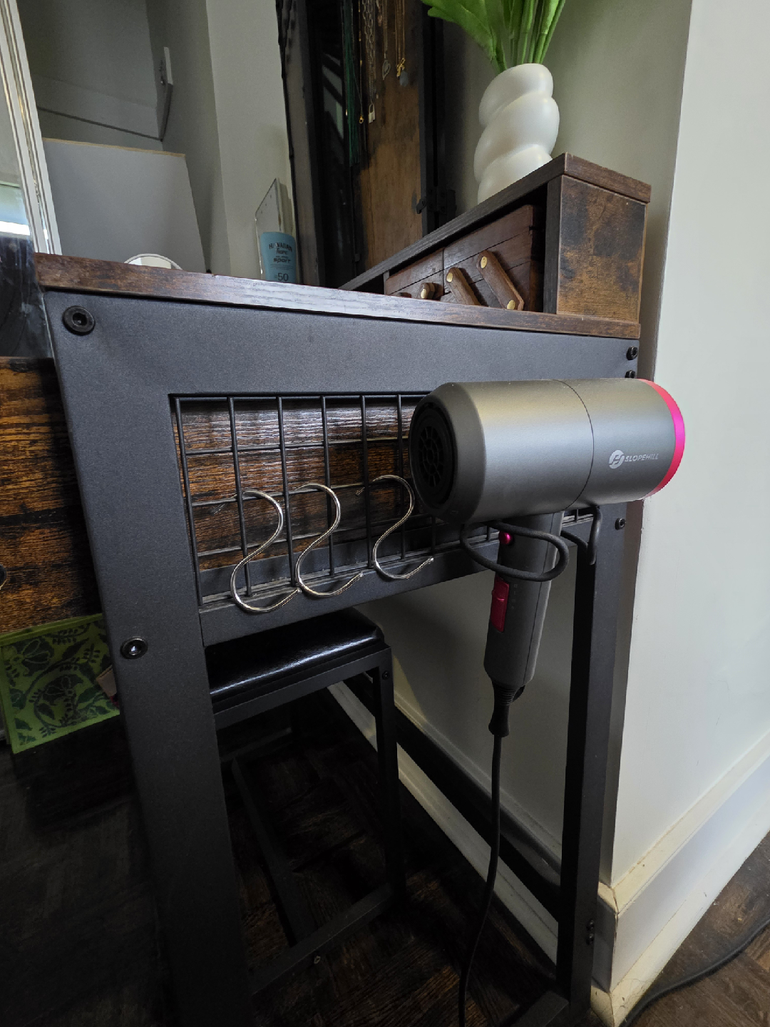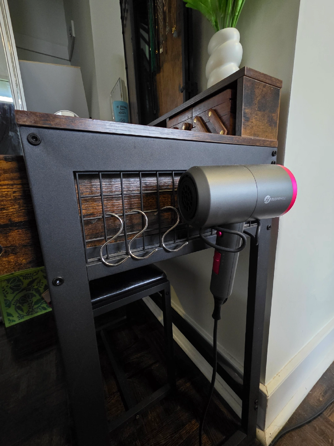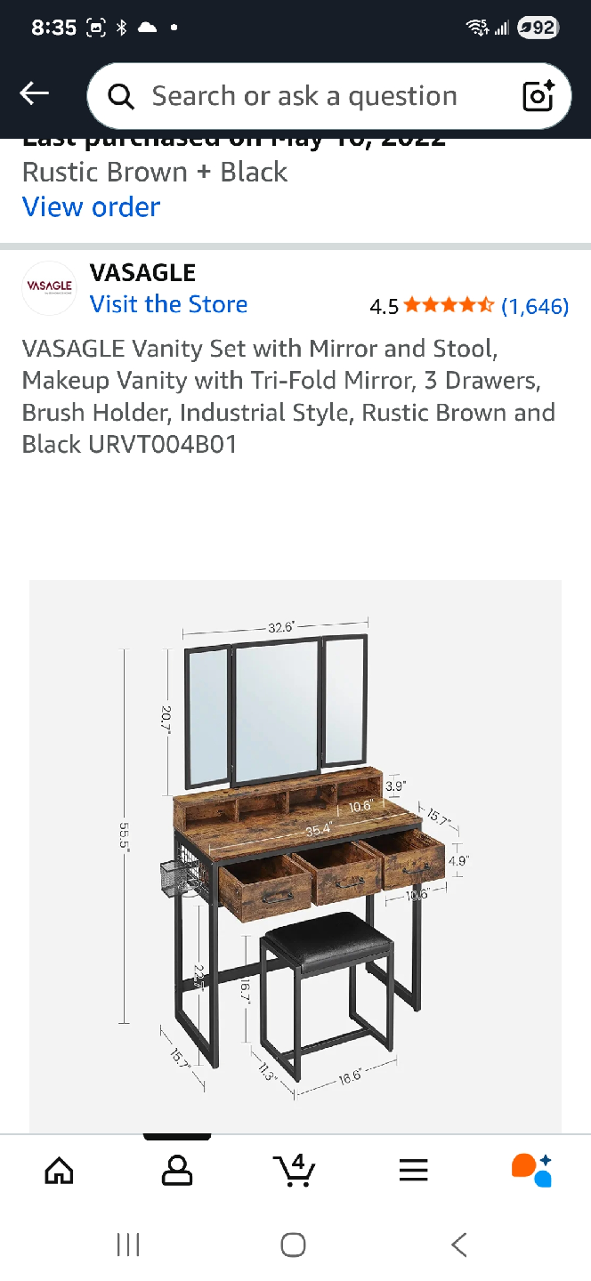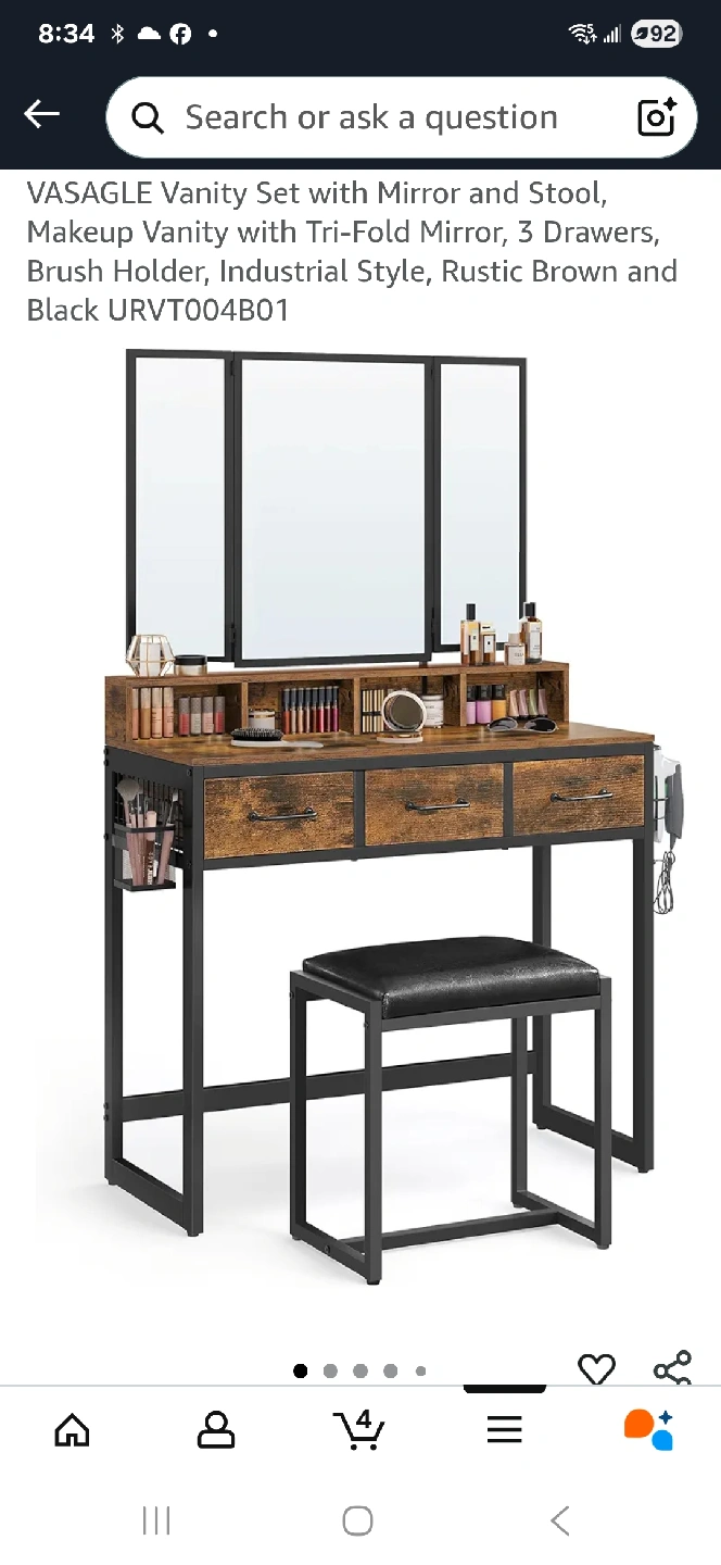 Selling a VASAGLE vanity set with a tri-fold mirror! It features a rustic brown and black industrial style. It also includes 3 drawers and a brush holder. Perfect for adding a touch of vintage charm to your space!