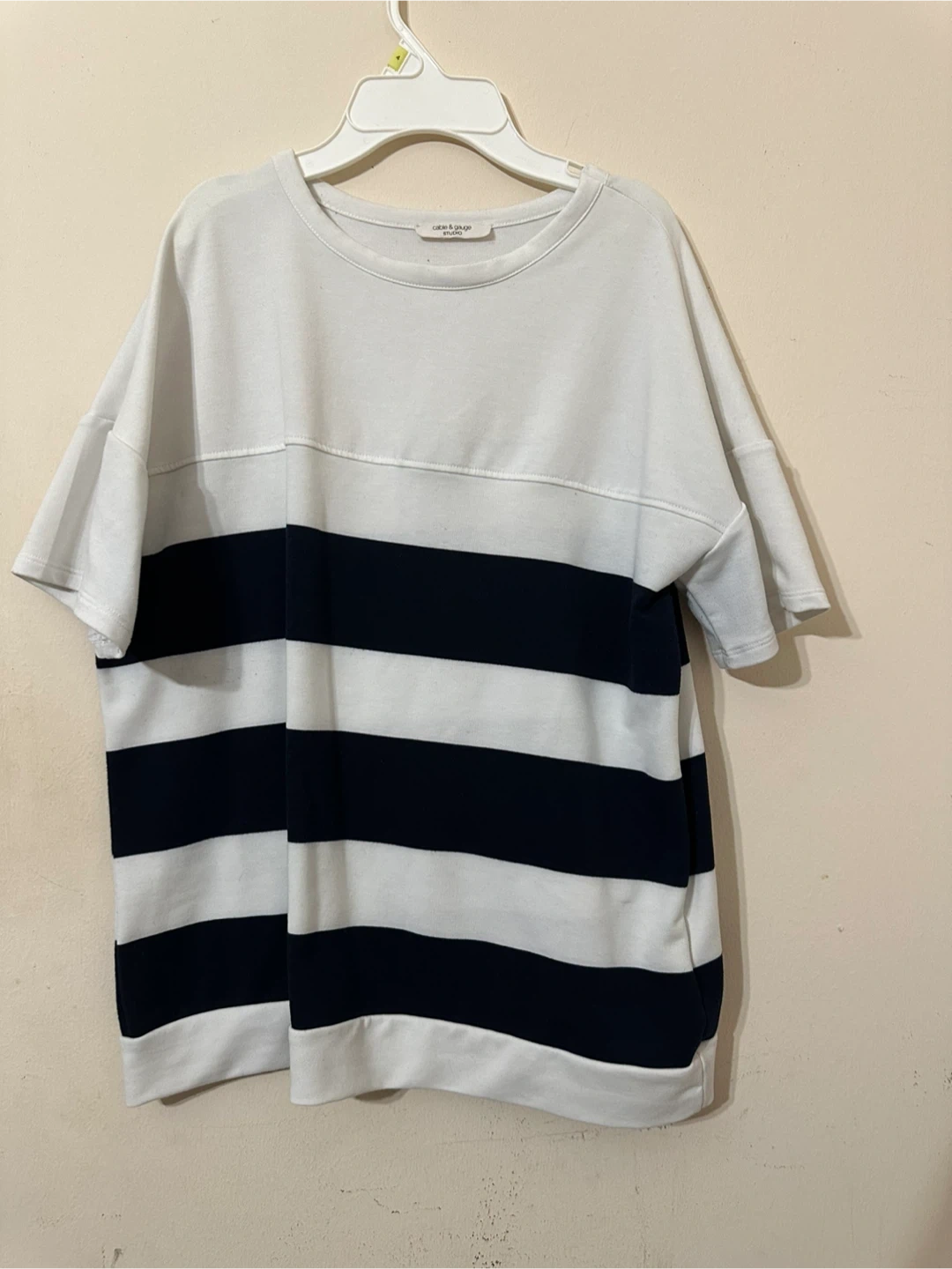 18Here's a Cable & Gauge Studio tunic top! It features a stylish striped pattern. The colours are white and navy. It's a comfortable and versatile piece for your wardrobe