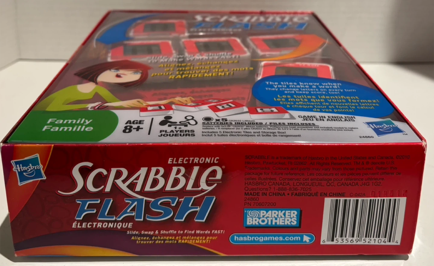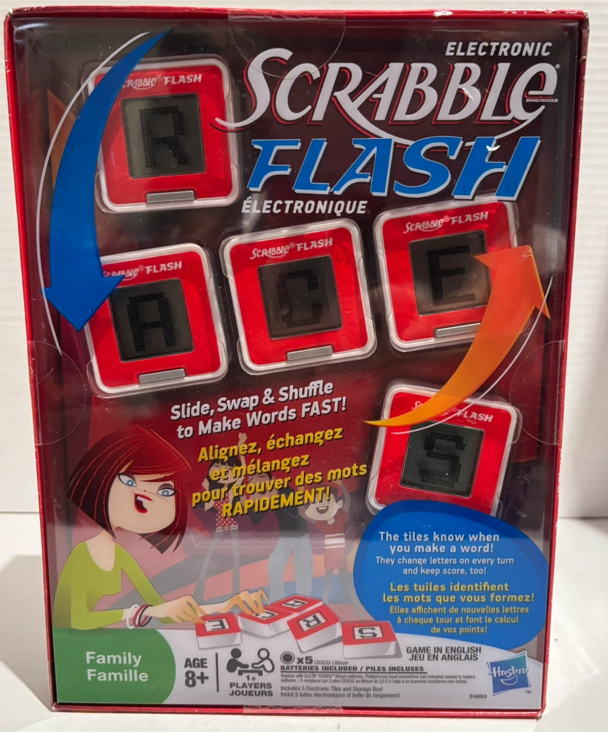 Selling an electronic Scrabble Flash game by Hasbro! It's a fun, fast-paced word game for ages 8+. Slide, swap, and shuffle the tiles to find words fast. It includes interactive SmartLink tiles and has 3 solo or competitive games. Batteries are included!