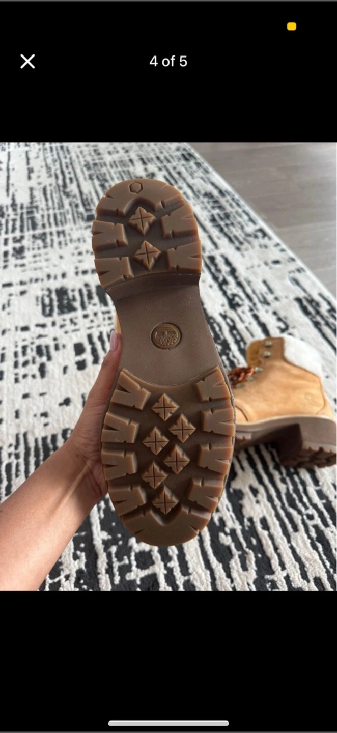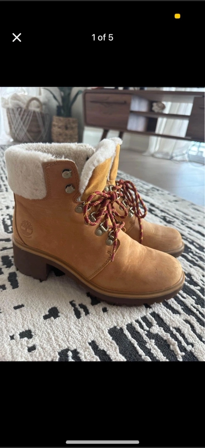 Selling a pair of Timberland women's Sienna high heel boots. They are a tan colour with a cozy sherpa-style lining around the top. The laces are a stylish red and gold. These boots are perfect for fall! With Teddy fleece lining. Waterproof. Size 8 In excellent condition. Used about 4-5 times. Heel 1.8 inches