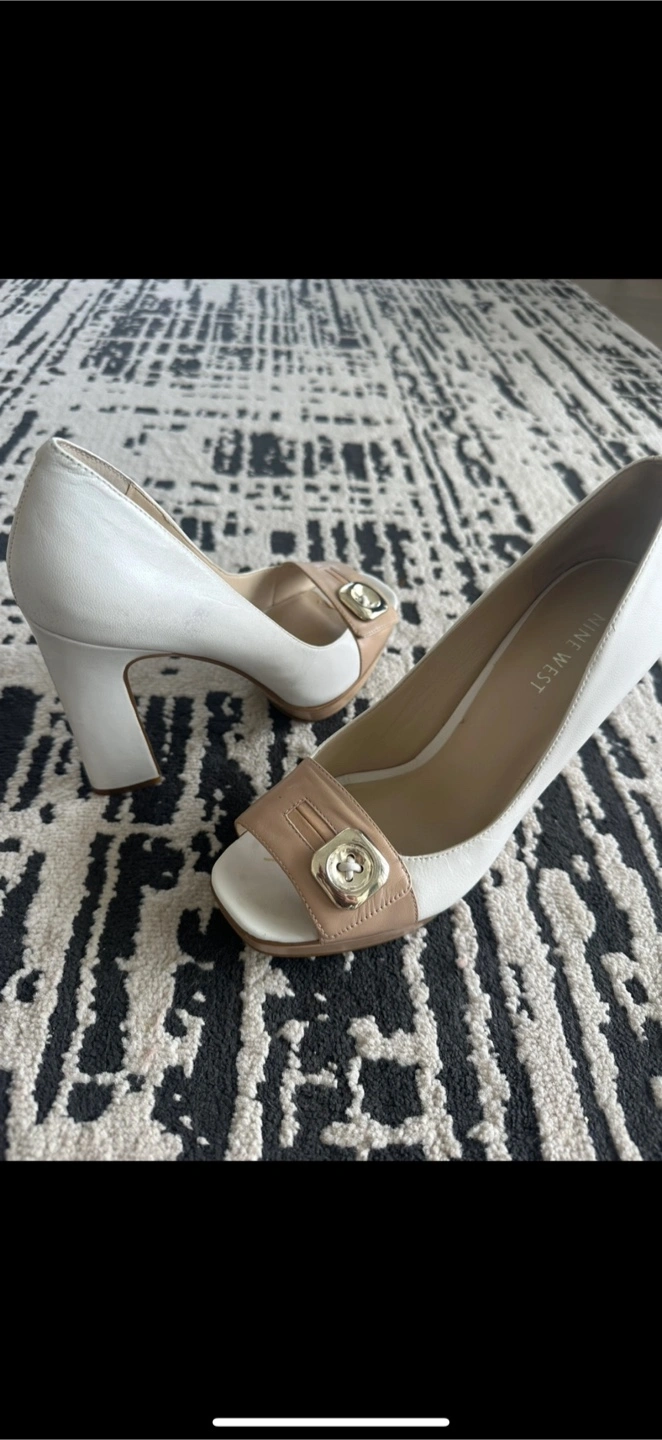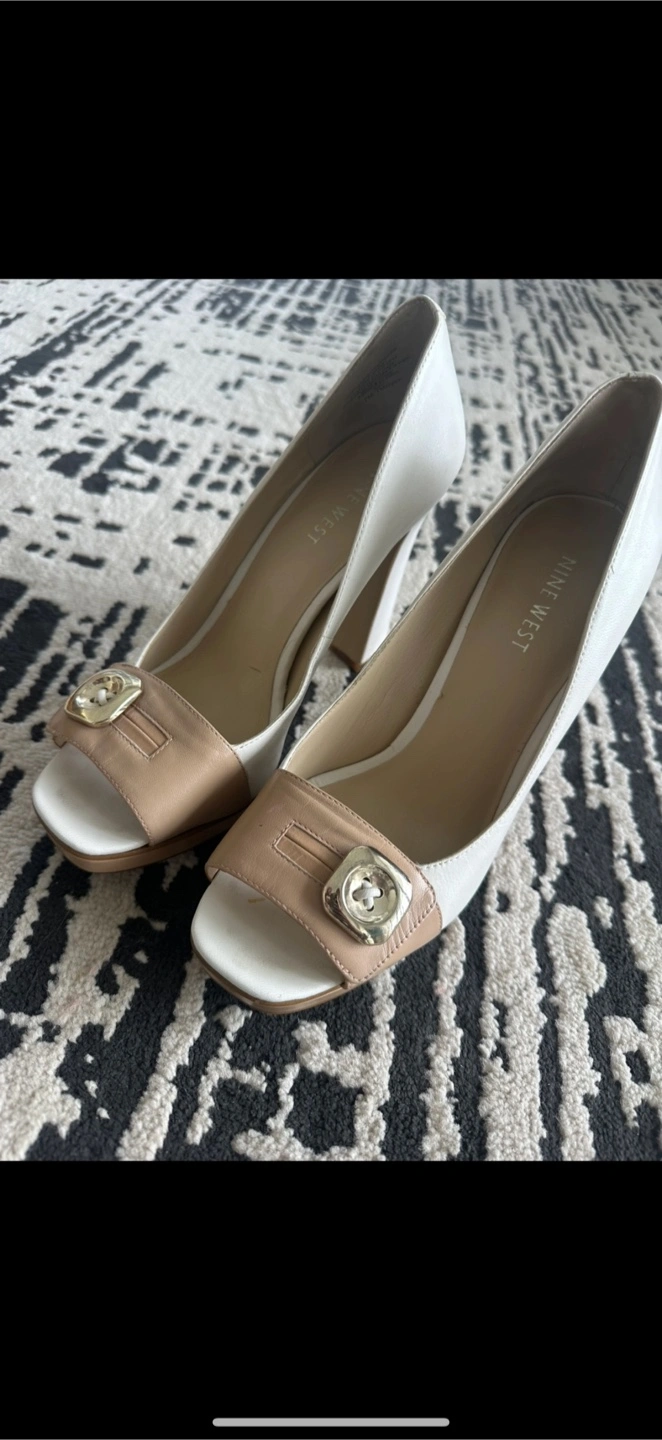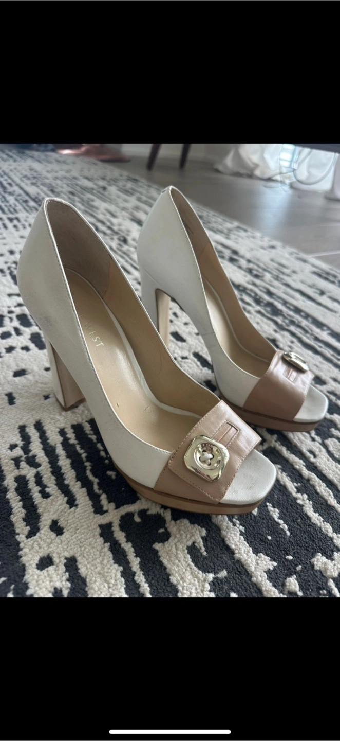 White and beige leather peep-toe heels. 4 inch Block heels. Gold-toned accents. Size 7. Worn only twice- I guess I can’t do a 4 inch fuel like I used to Excellent condition. Purchased for $110.