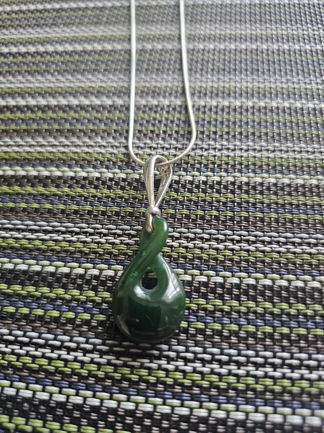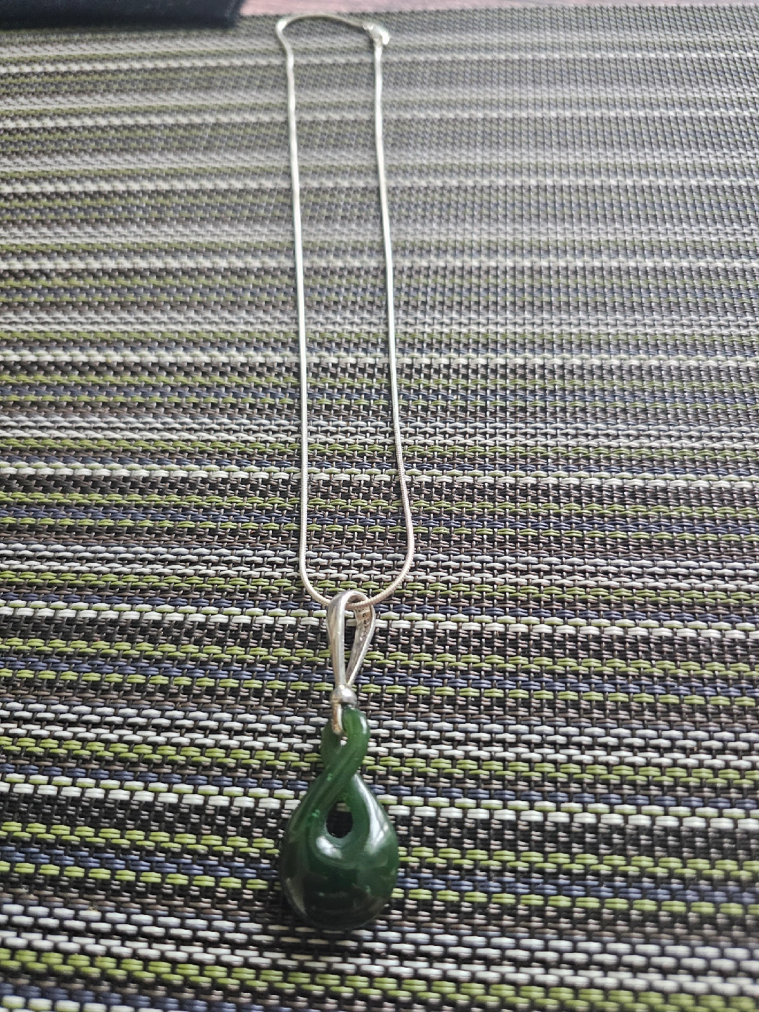 Selling a lovely green jade twist pendant necklace. The pendant has a unique twisted design and a smooth, polished finish. It's a beautiful piece to add to your collection!