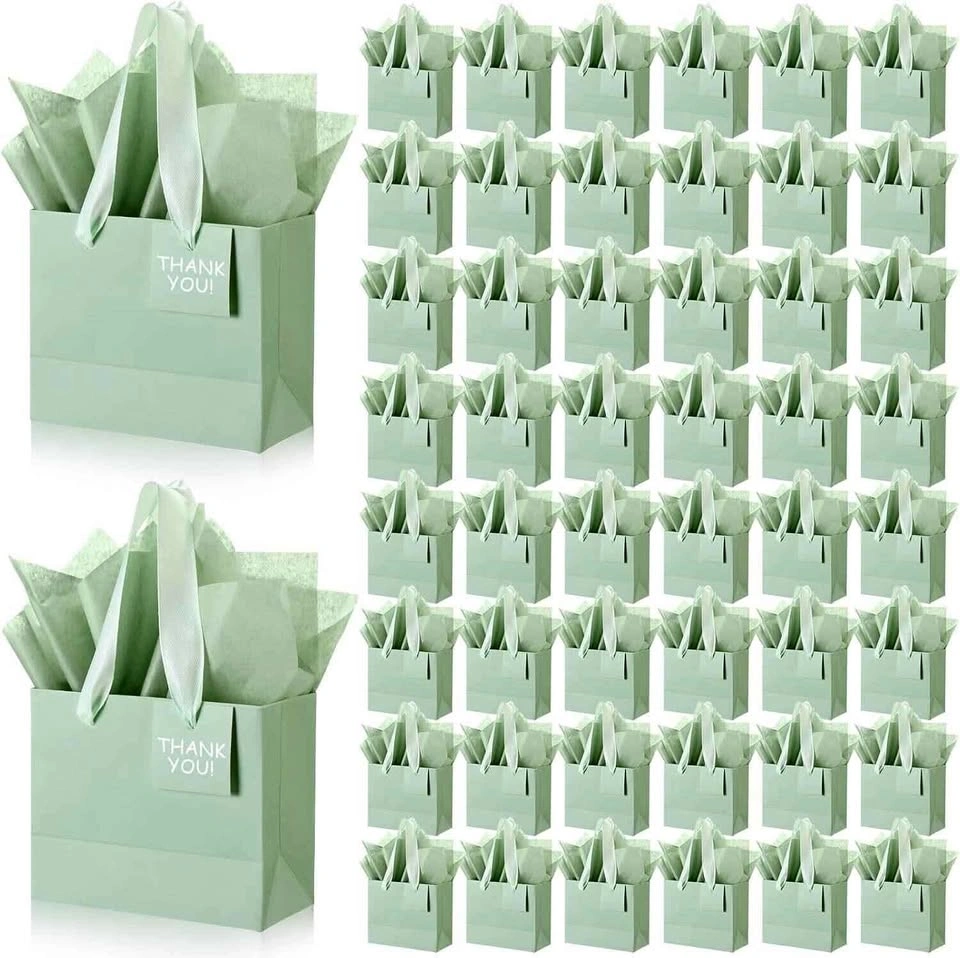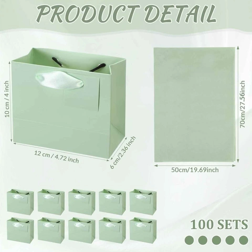 This pack of 100 small green paper bags is suitable for those who need to prepare multiple gifts for various occasions. With 100 paper gift bags included, you can easily create beautiful and special gifts for your friends, family, or guests. The gift bags come with ribbon handles, gift tags and tissue paper, making them easy to create a cohesive and elegant look. The small bags for gifts are designed with the proper size, measuring about 4.7 x 2.4 x 3.9 inches/ 12 x 6 x 10 cm (L x W x H), making it ideal for small items such as jewelry, candies, snacks, or small toys. The gift tag is around 1.57 x 1.57 inches/ 4 x 4 cm, providing enough space for you to write warm messages or names for the recipients. The included tissue paper measures about 27.6 x 19.7 inches/ 70 x 50 cm, providing ample coverage for wrapping your gifts. These gift bags with tissue paper, handles, and tags are made of quality kraft paper, which is sturdy, reliable and reusable, not easy to fade, deform or break. The material ensures that the gift bags can safely hold a variety of items without tearing or breaking. The kraft paper also adds a natural and rustic touch to your gifts, making them stand out. Each gift bag is equipped with a ribbon handle, making it easy to grip and carry, providing a convenient using experience. The handles are sturdy and securely attached to the paper bags for party favors, and the sturdy bottoms allow the gift bags to stand on their own, ensuring that your gifts can be transported safely and conveniently. These paper gift bags with handles, tissue paper, and tags are versatile and suitable for various occasions, including 4th of july, birthdays, back to school, wedding showers, christmas, bouquets, gifts wrapping, and more. They can be applied for packaging small gifts, candies, jewelry, or party favors, as an ideal and practical gifts for your friends or guests. The plain look of the bags allows for DIY decorations to match the theme or event.