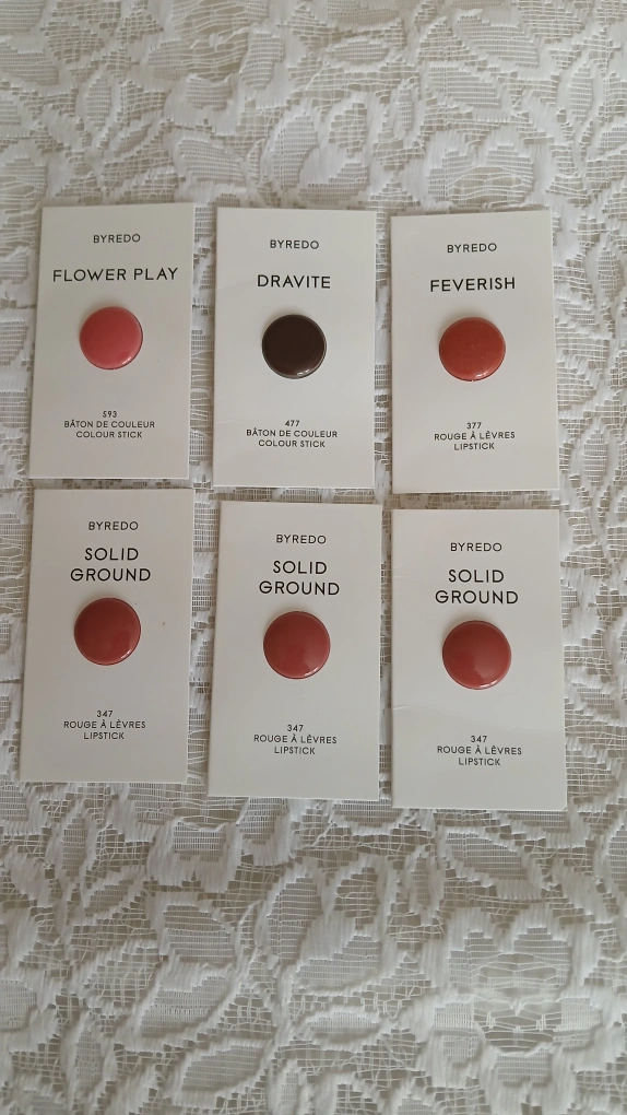 all six samples of Byredo lipsticks for $5.00. brand is made in Italy. there are 4 different colours. porch pickup at Dufferin and Bloor st
