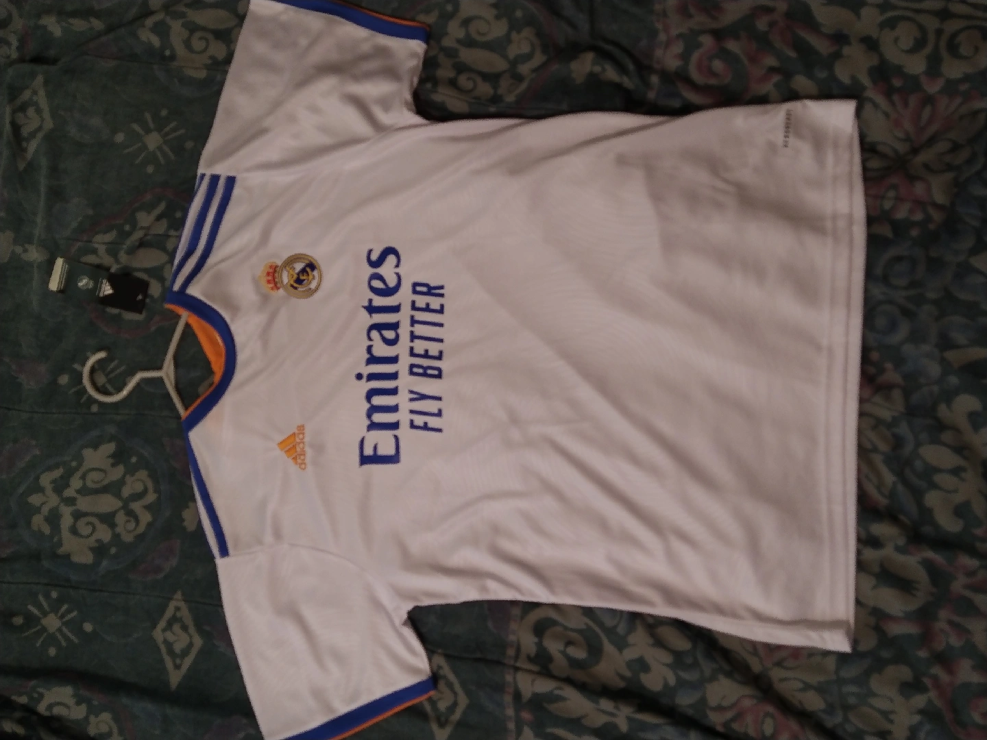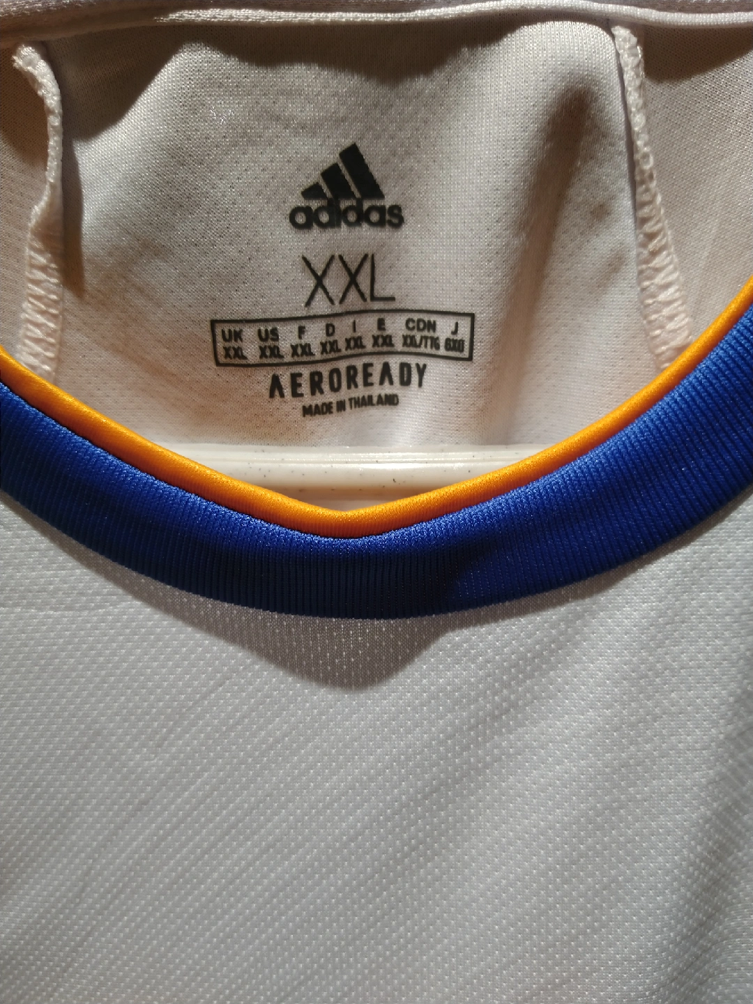 Selling an Adidas Real Madrid jersey in size XXL It's white with blue and orange detailing The jersey features the Emirates Fly Better logo It's made with Aeroready technology, perfect for staying cool and comfortable