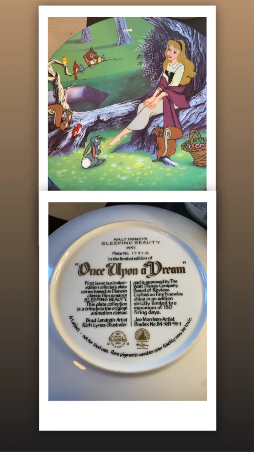 15Selling a Walt Disney's Sleeping Beauty collector plate from 1991. It's plate number 1747 A in the limited edition of "Once Upon a Dream". This collector's plate is the first issue in a limited edition series based on Disney's classic film romance, Sleeping Beauty. The plate collection pays tribute to the original animation classic. The artists are Brad Landreth and Rich Lynes, and Joe Morrison.