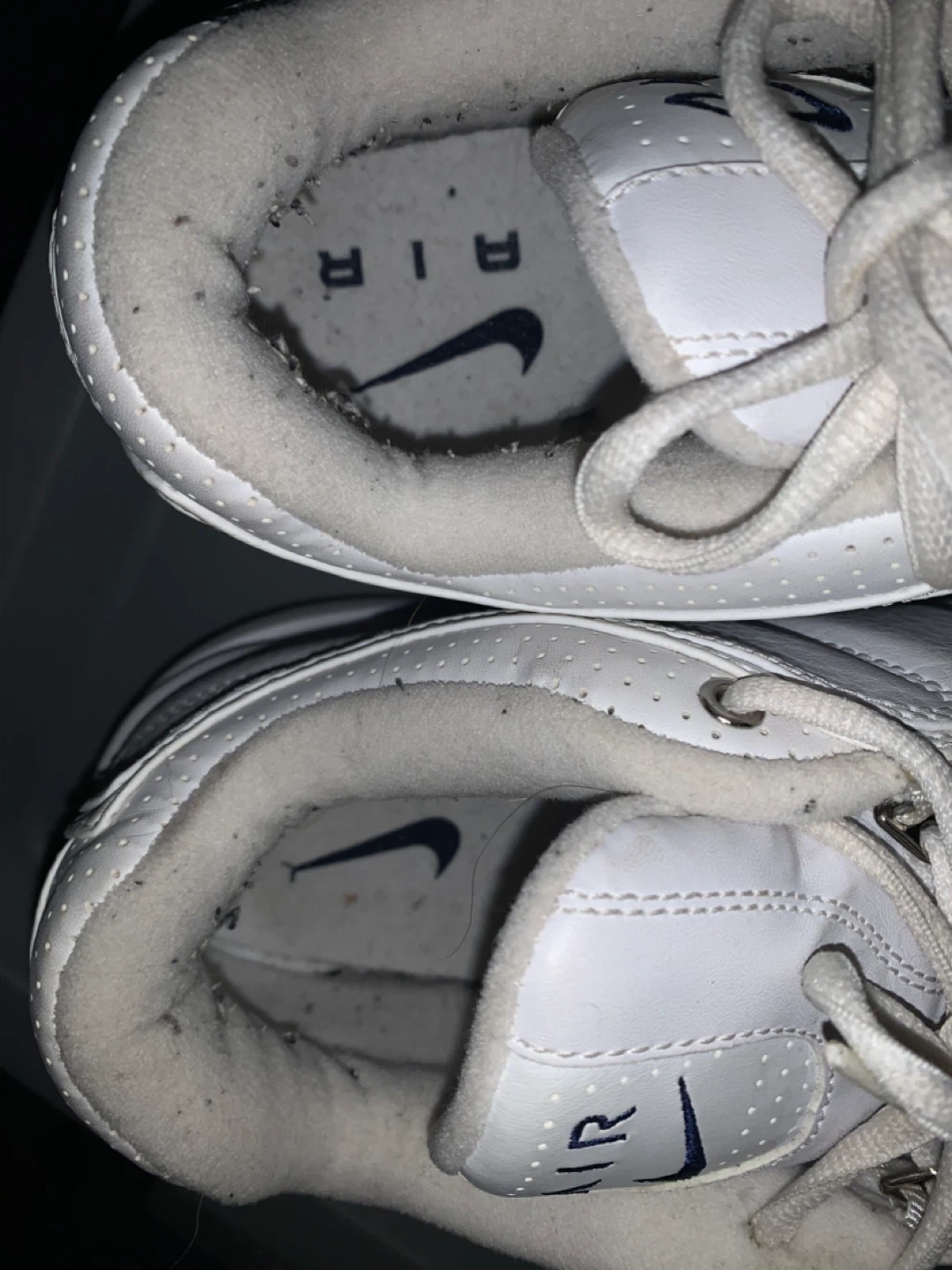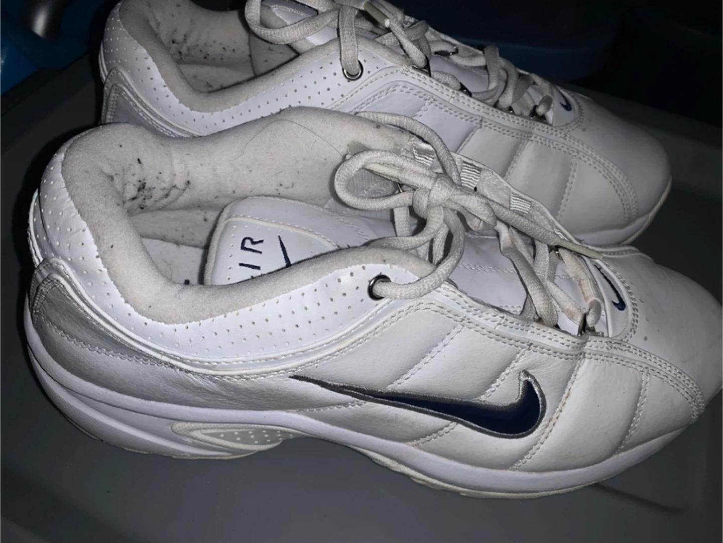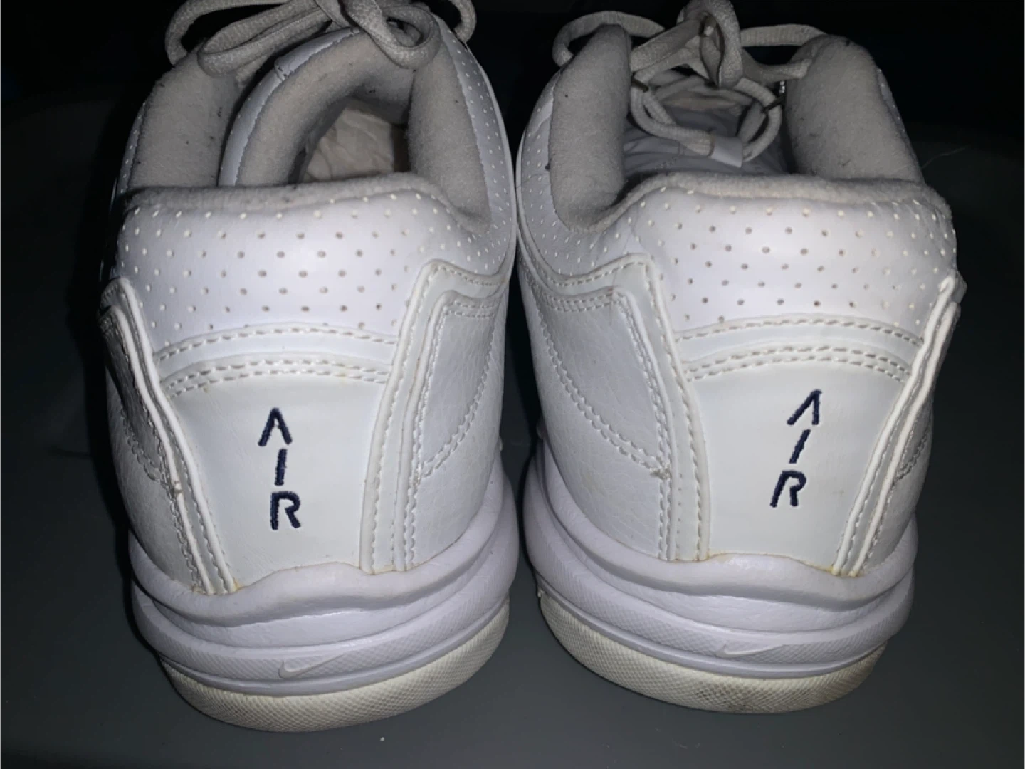 Classic Nike Air sneakers in white with black details. Comfortable and durable, great for everyday wear, workouts, or casual style. • Condition: Used, some wear (see photos), but still in good shape • Size: Men’s 12 US / 11 UK / 46 EU • Color: White with navy accents • Made in Indonesia Reliable, timeless sneakers perfect for anyone looking for a budget-friendly pair of Nikes.