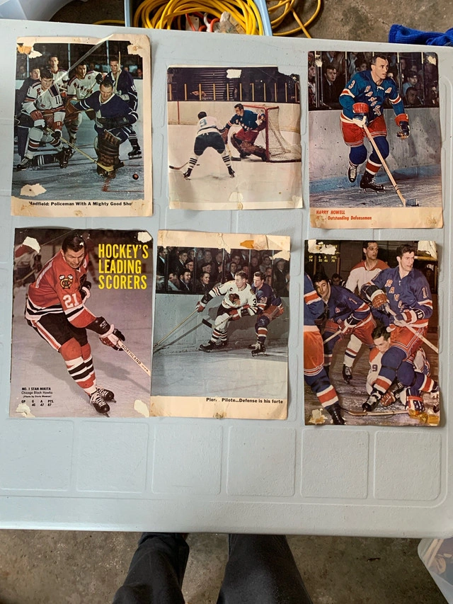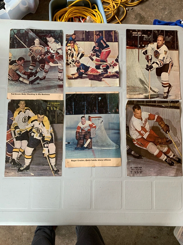 Selling a collection of vintage hockey photos, featuring iconic players and classic moments from the game's history. These photos capture the essence of hockey's golden era and would make a great addition to any sports memorabilia collection. The photos are in fair condition considering their age, showcasing vivid colours and sharp details that truly bring the game to life. I believe they came out of hockey magazines from the 70s. There are 6 altogether. The pictures in the listing show both sides of the photos. Whether you're a die-hard hockey fan or a collector of vintage sports memorabilia, these photos offer a unique glimpse into the past and celebrate the rich history of the sport we all love! They're sure to spark conversations and evoke cherished memories of legendary players and unforgettable games! If the ad is still up, it's available!