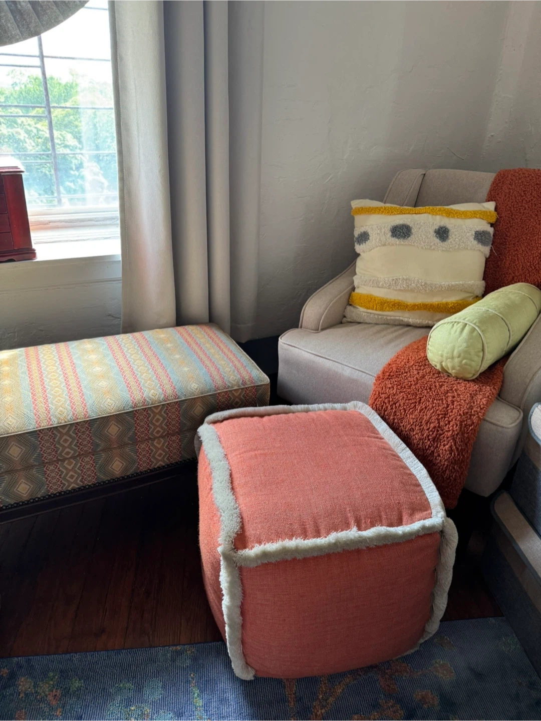 Selling a cute rustic patio living room farmhouse decor foot stool! It's a great addition to any living space. The color is a vibrant coral, perfect for adding a pop of color to your room. It can be used as a foot stool rest or a decorative accent.