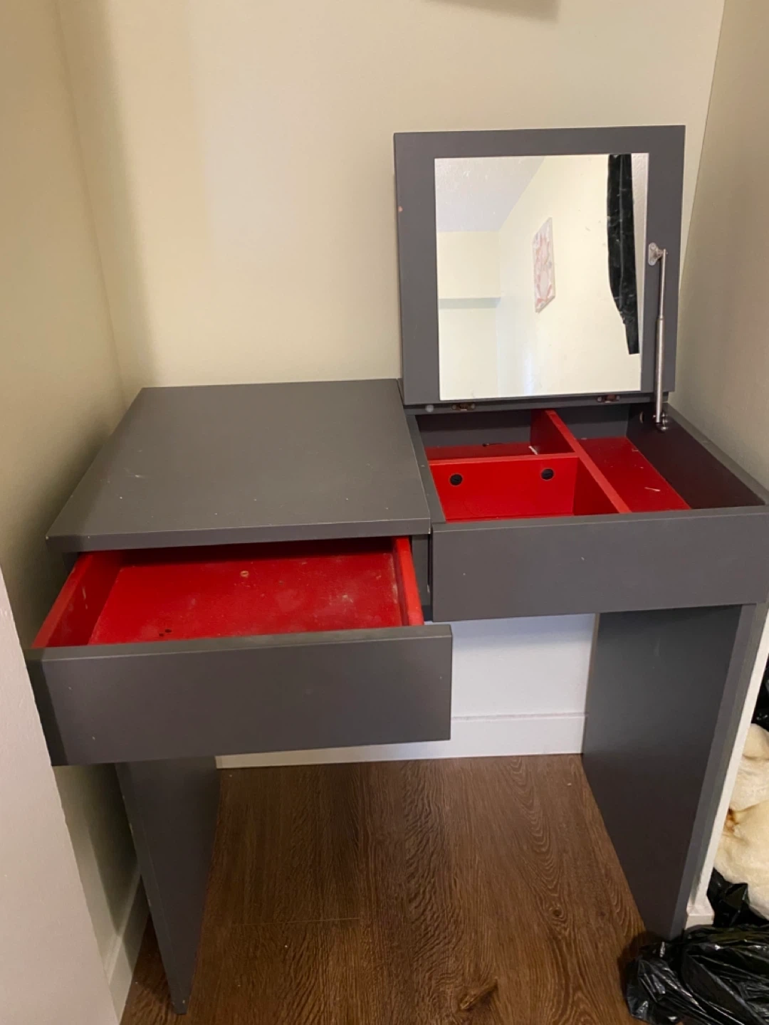 Selling a vanity table with a mirror. It features a grey exterior with a vibrant red interior in the drawer and compartments. Perfect for a bedroom or dressing area!