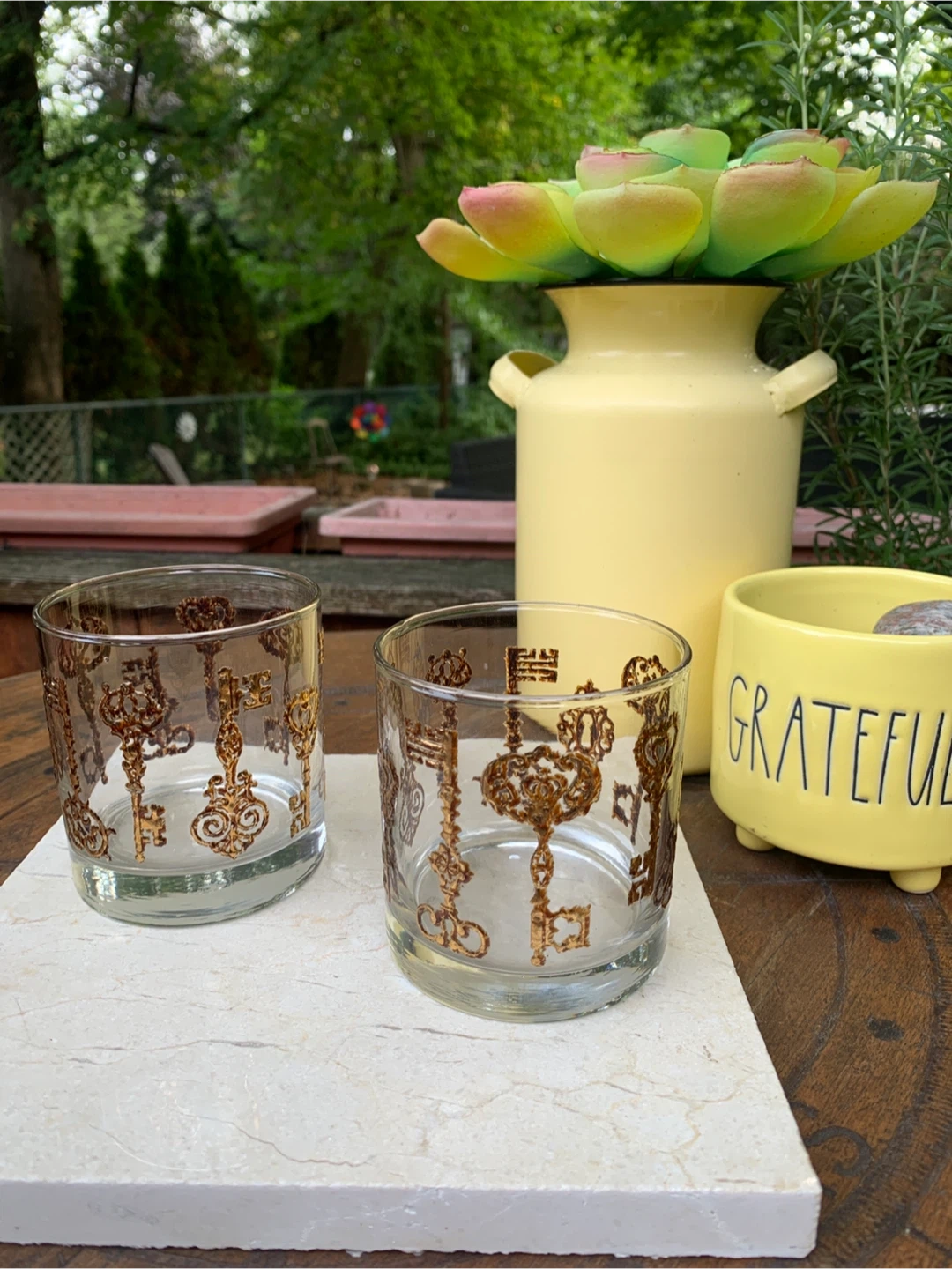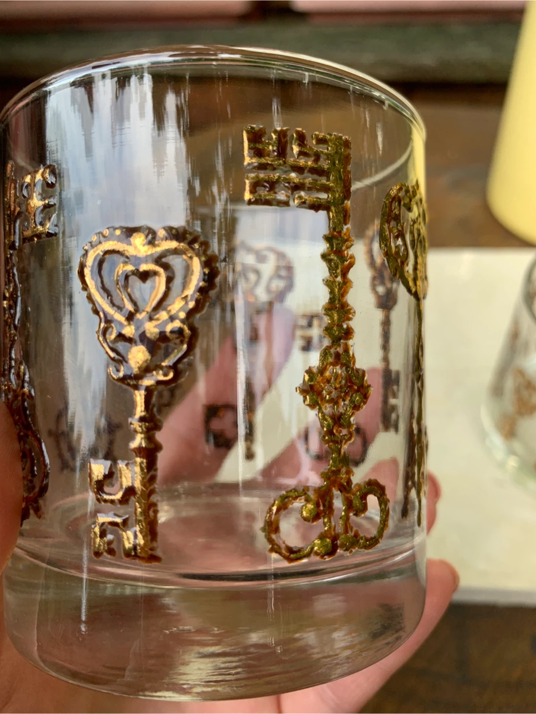 Here's a stylish pair of vintage Libbey glass tumblers featuring a unique gold skeleton key design! Most likely from the 1960-1970’s. They are perfect for adding a touch of elegance to your drinkware collection. They hold a 10oz drink comfortably, be it whiskey or rum and Coke. These tumblers are in great condition and ready for a new home to give your barware a glow up!✨ Cash only please. Props not included.