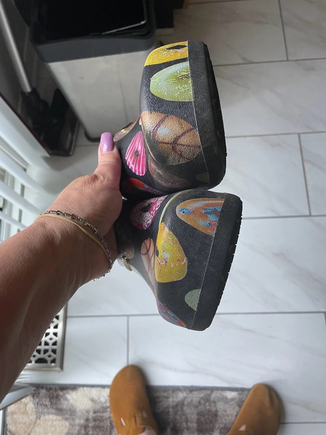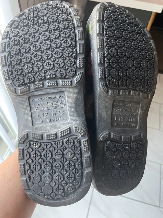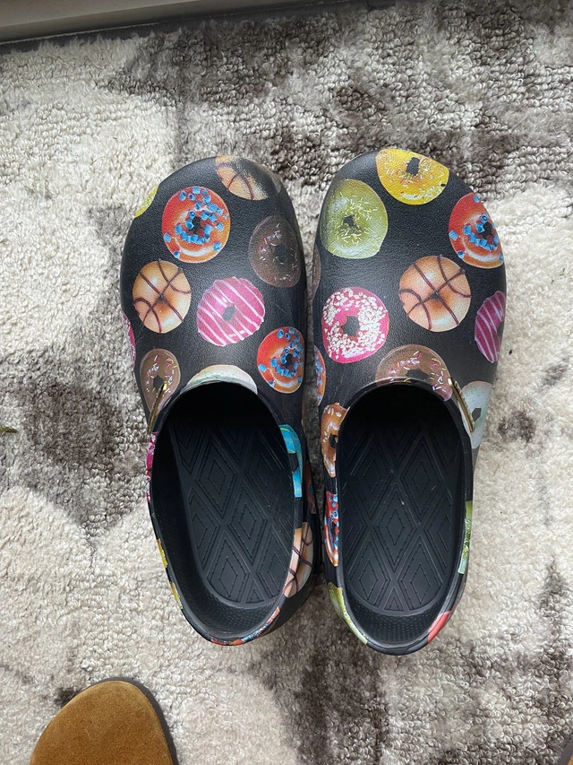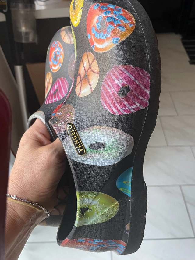 Step out in style with these Vangelo Professional Slip Resistant Clogs, adorned with a fun donut print! These clogs are a men's size 10 / women's size 12, perfect for anyone in the food service industry or just looking for a comfortable, quirky shoe option. These have been worn, so they're not brand new. I used them in the garden a couple of times.