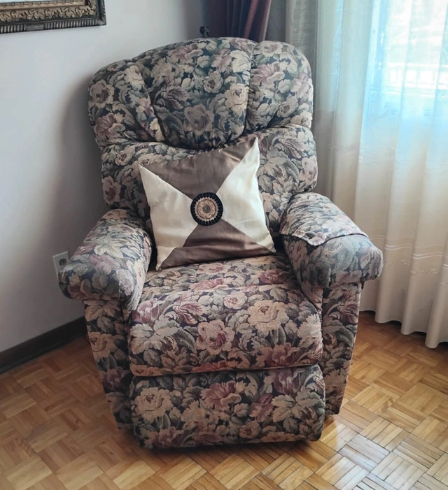 This floral patterned La-Z-Boy recliner is perfect for adding a touch of vintage charm with with added comfort, remote, massage, heated seat, and tilted foot rest with which needs adjusting. Note: the chair is in good use condition. The pillow, as seen in the photos, is yours if you want it. Additional details include: Comfortable reclining function remote control. Massage lower or upper back and seat and warmer. The listing price is reflective of its condition, sitting at a sweet spot of $150 CAD. If the ad's up, the chair's available!