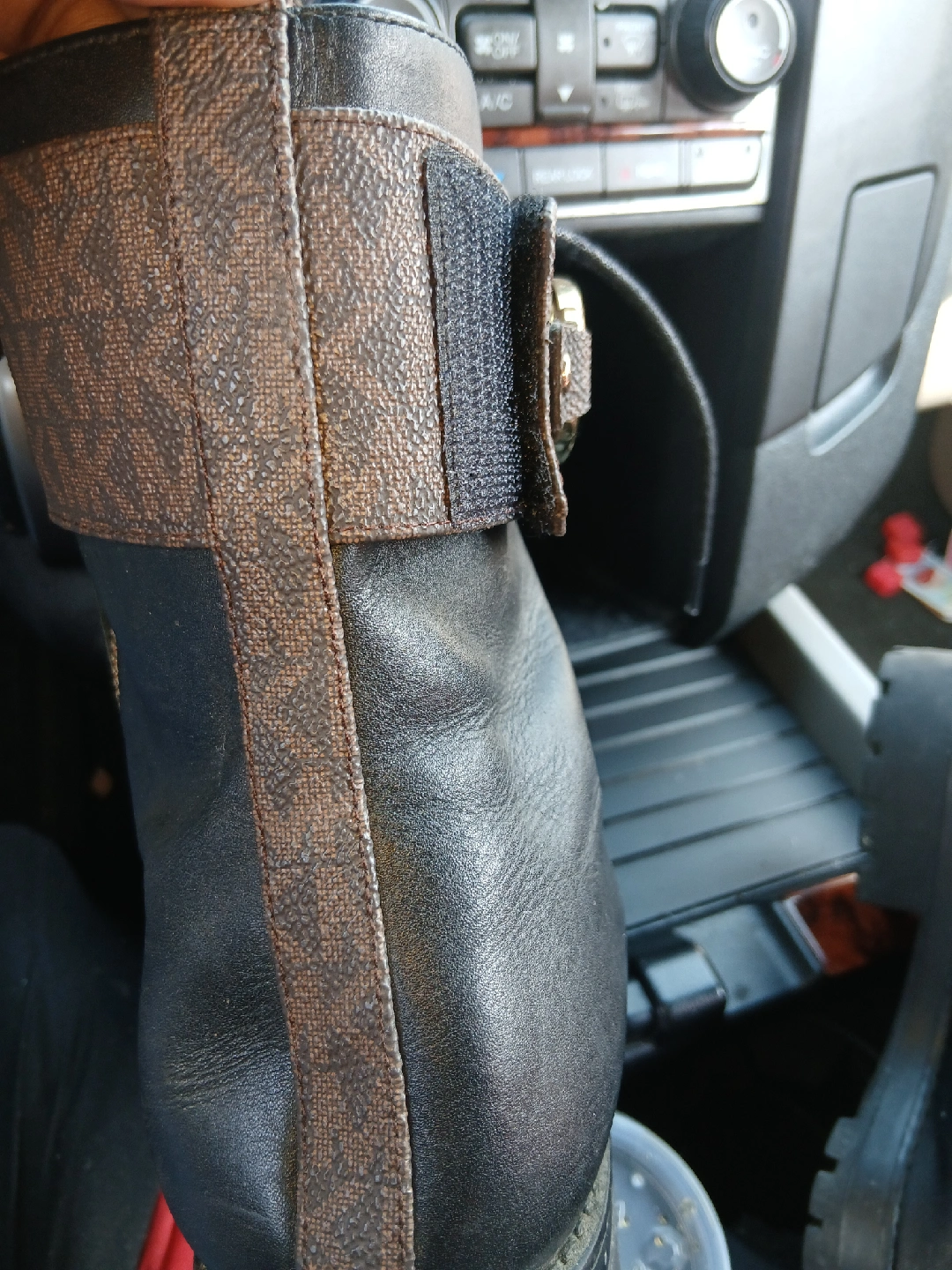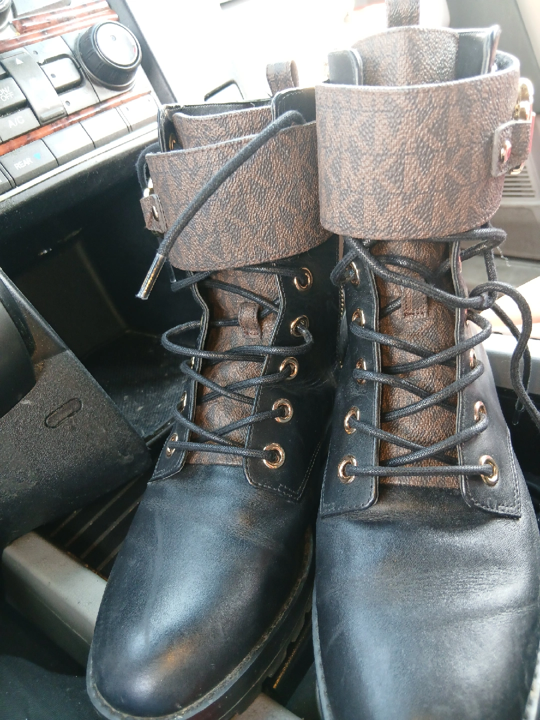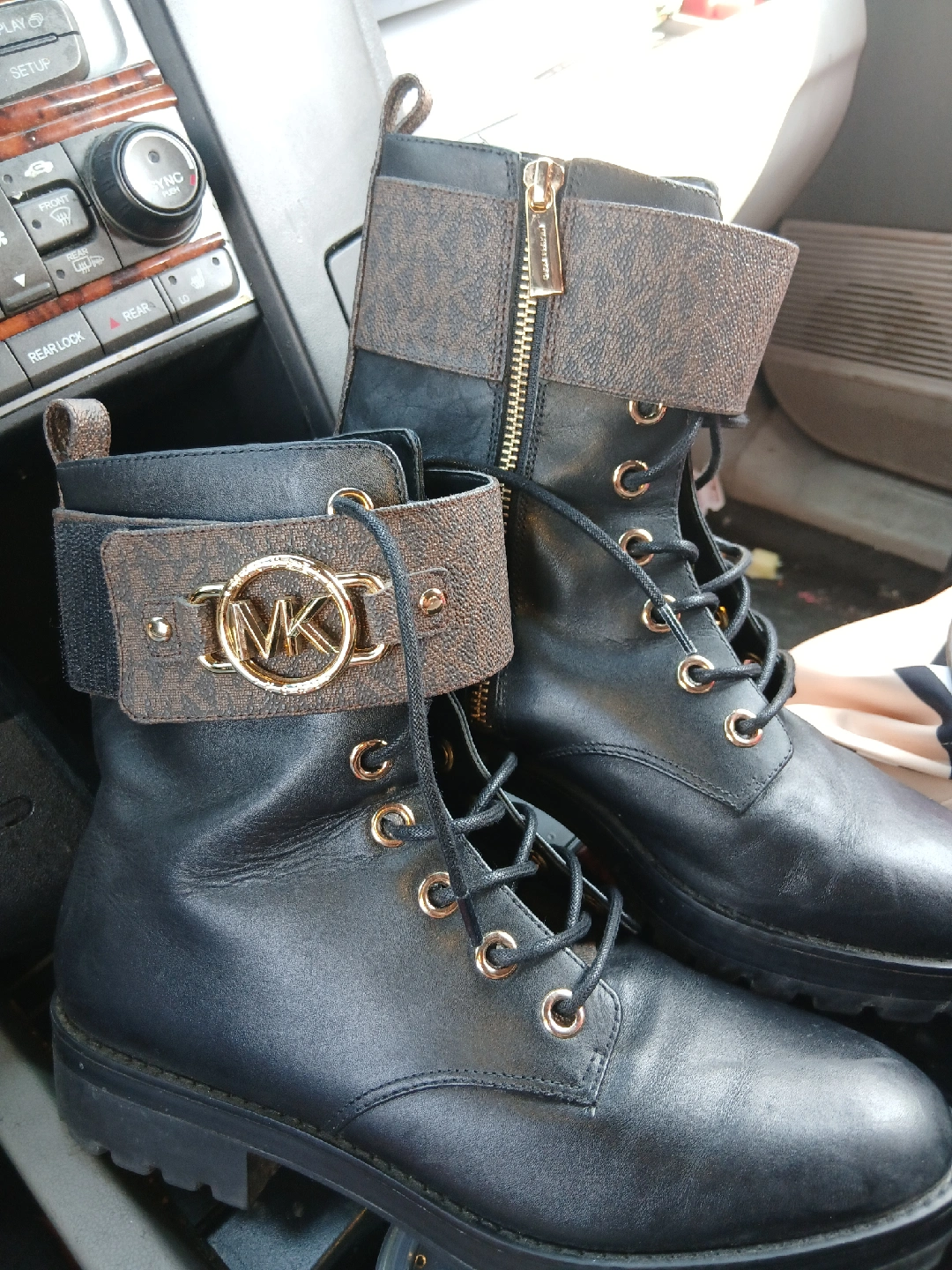 Selling a pair of Michael Kors black leather boots. They feature a stylish brown accent with the MK logo and gold hardware. These boots are in great condition and ready for a new home!