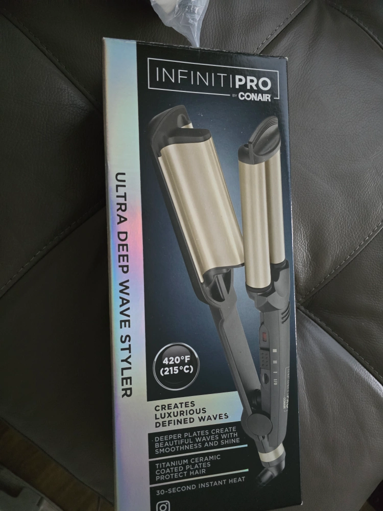 Get those luxurious, defined waves you've been dreaming of with this INFINITIPRO by Conair Ultra Deep Wave Styler! It's brand new in the box and ready to create beautiful waves with smoothness and shine. The titanium ceramic coated plates protect your hair, and it heats up in just 30 seconds!