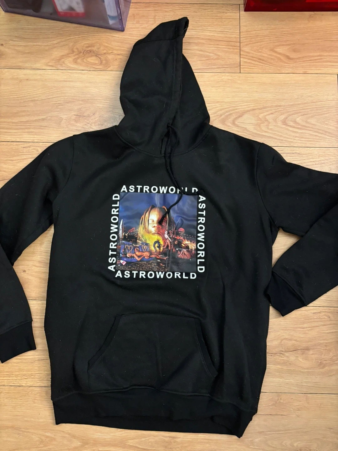 Selling a Travis Scott Astroworld hoodie in black. The front features the iconic Astroworld graphic, and the back says "Wish You Were Here, Travis Scott Live, Gov Ball NYC 2018". It's in great condition and ready for a new home!