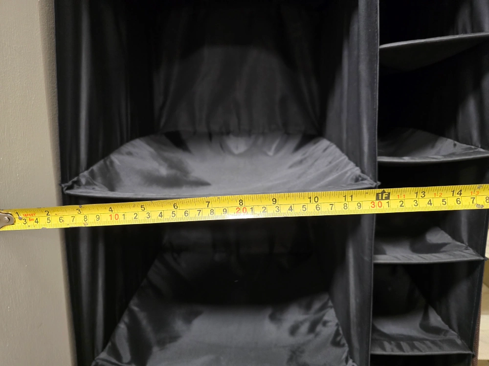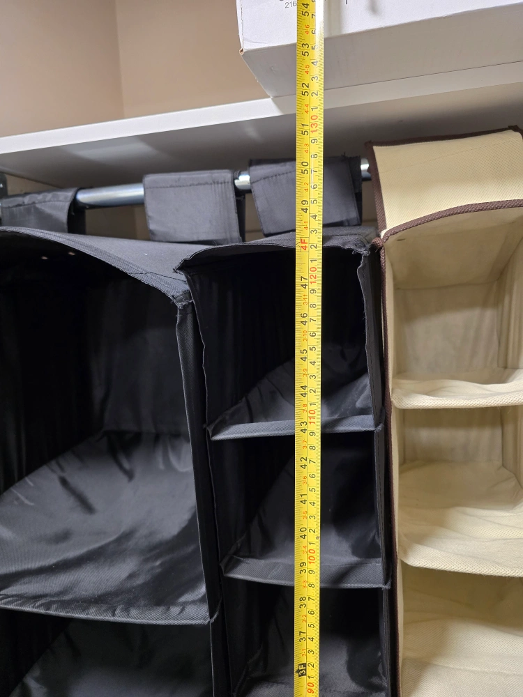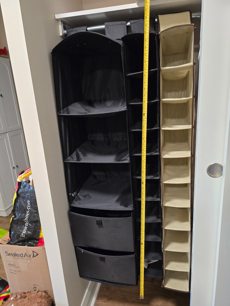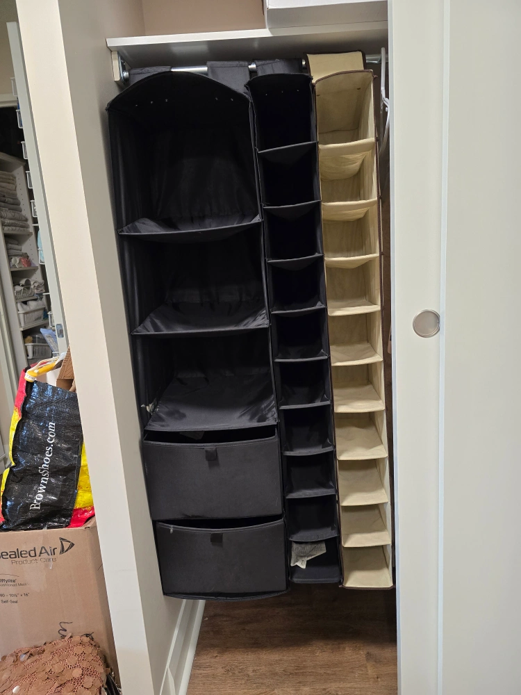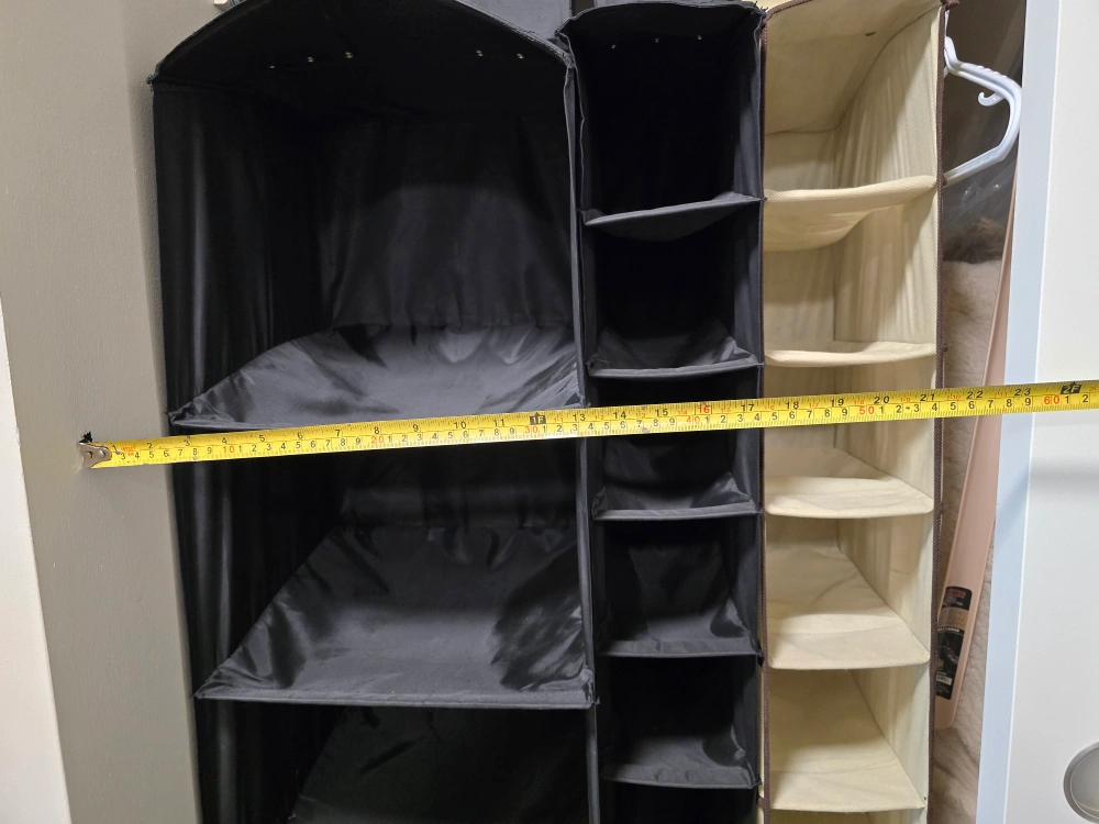 Declutter your closet with these handy hanging organizers! One is black with shelves and two drawers at the bottom. The other is beige with multiple shelves. They both hang easily in your closet to maximize storage space