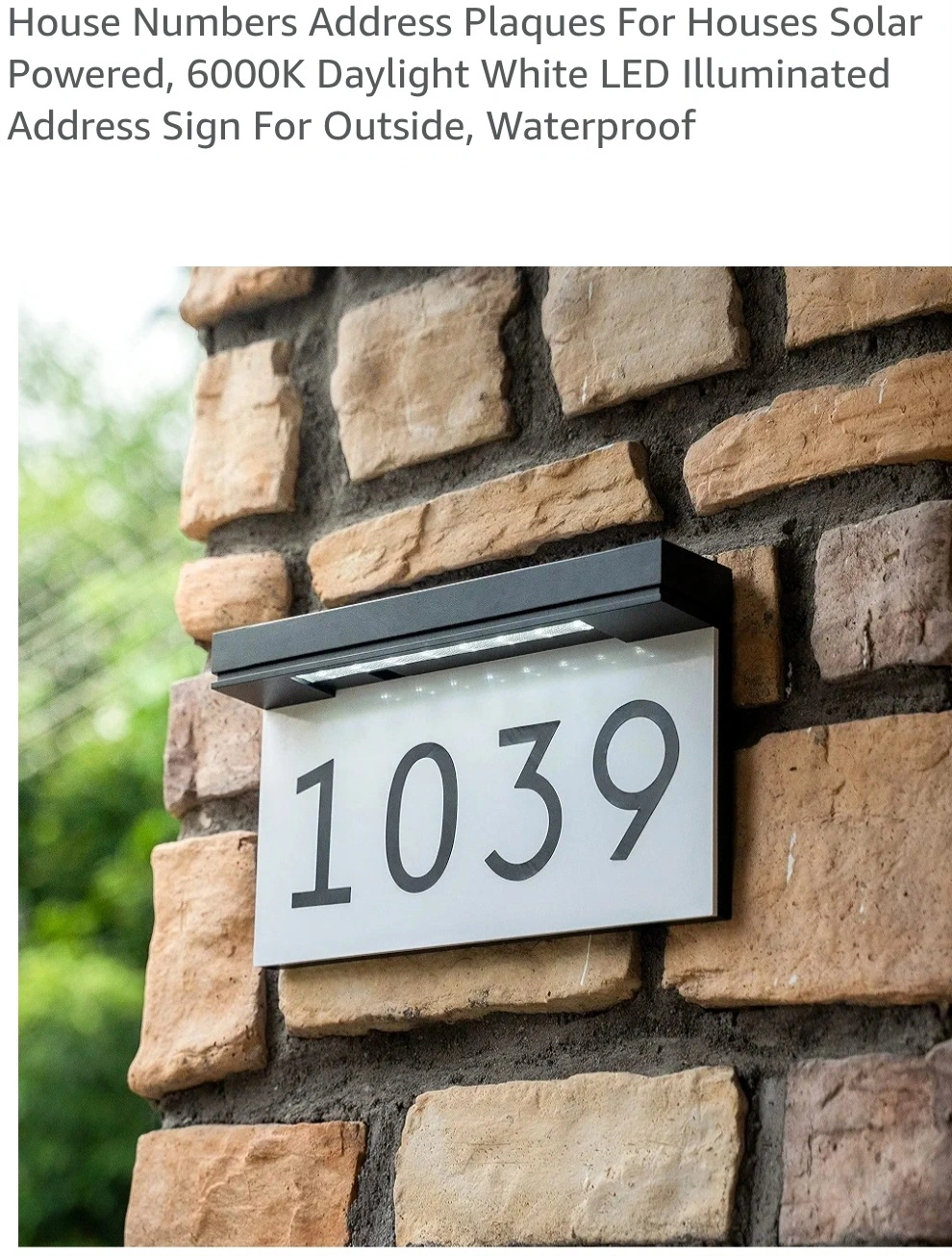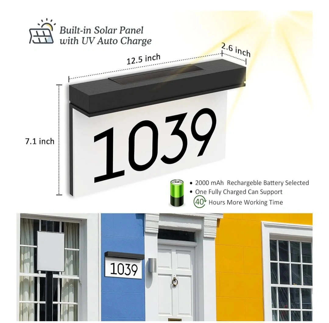 I'm selling a solar-powered LED illuminated address sign for houses. It features a 6000K daylight white LED for clear visibility. The sign is waterproof, making it suitable for outdoor use. It has a built-in solar panel with UV auto charge and a 2000 mAh rechargeable battery, which supports 40 hours more working time when fully charged. Dimensions are approximately 12.5 x 2.6 x 7.1 inches