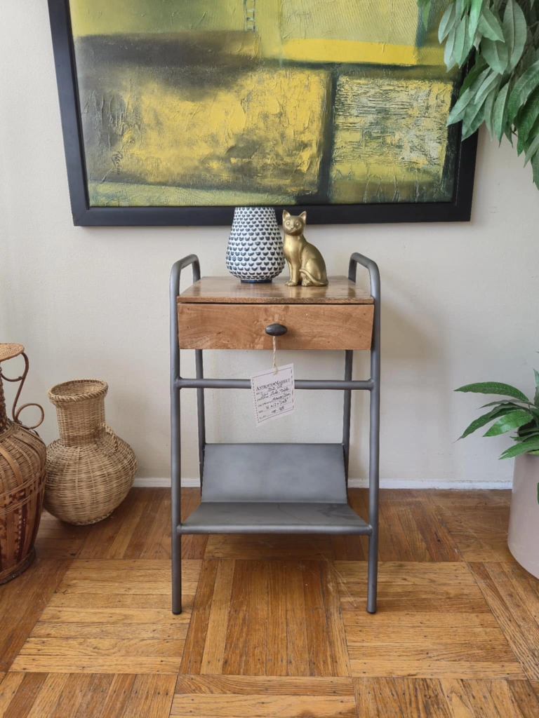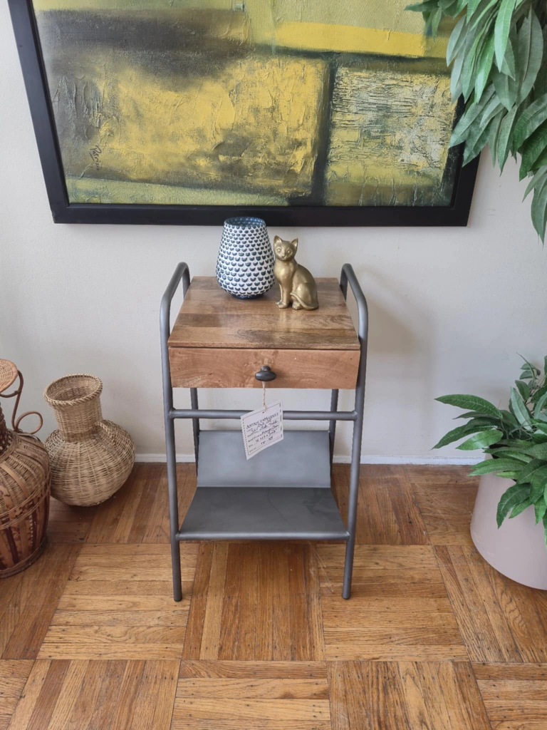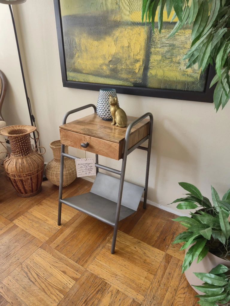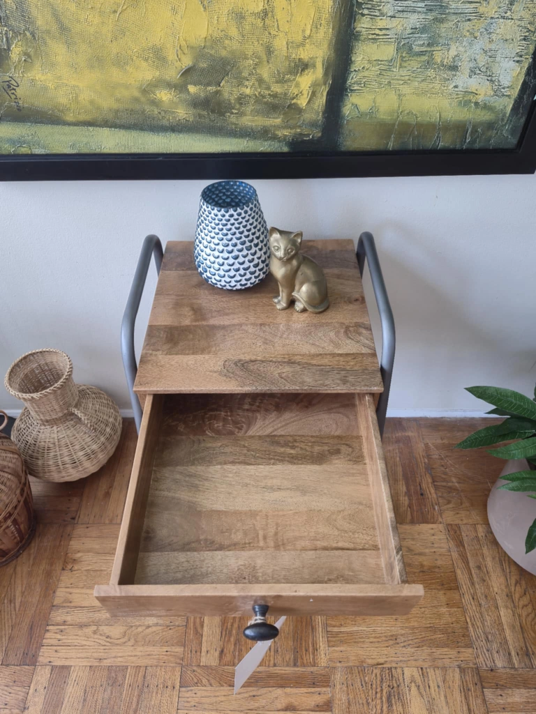 Elevate your home decor with this stylish modern side table, crafted from rich mango wood. Featuring a sturdy metal frame, a single spacious drawer, and a lower shelf for extra storage, this piece blends functionality with contemporary design. Perfect for any living room or bedroom.