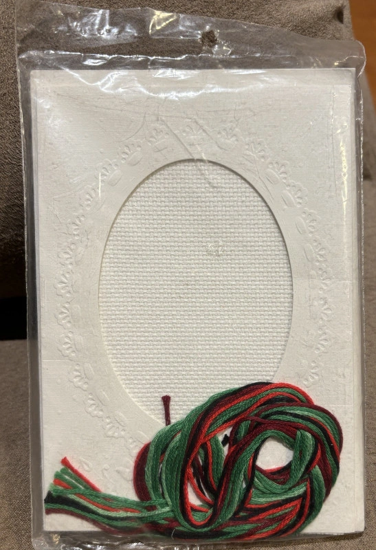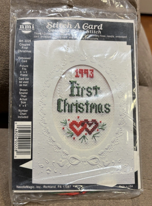 NMI Stitch-A-Card Counted Cross Stitch Kit 4” X 6”. Comes with cotton embroidery floss thread, 18 count aida fabric, needle, embossed card, envelope, backing card & instructions. First Christmas for baby, wedding. Says 1993 but you can put 2025.