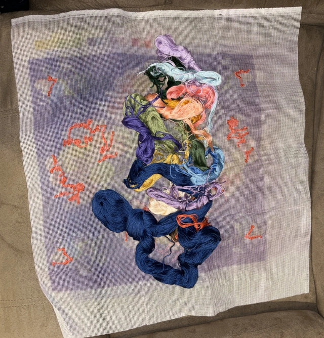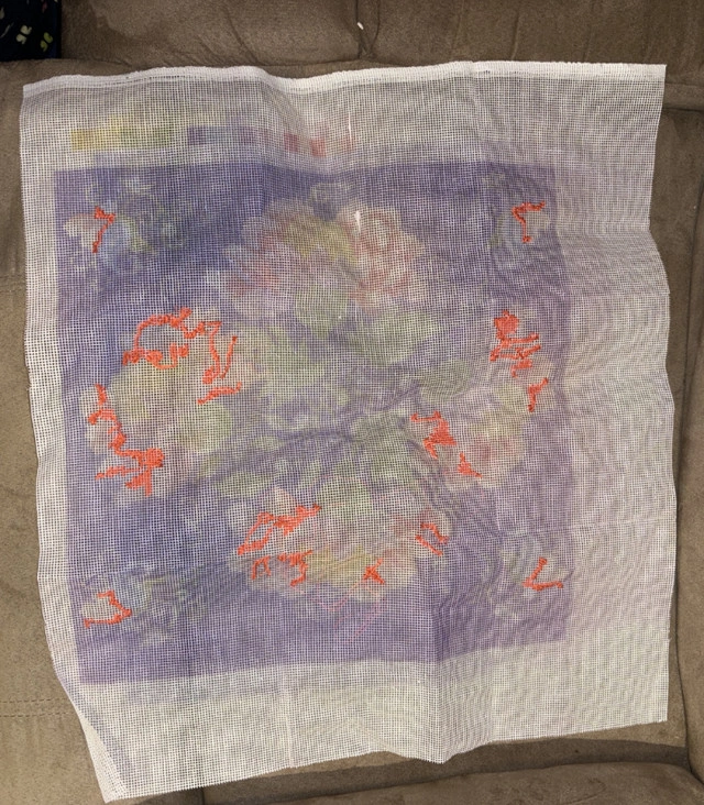Needlepoint kit Dimensions 19” X 17” Multicolour flowers on a purple background Comes with all the floss threads Has been started but only a little bit done Condition: Used - Like new For Sale By: Owner Curbside pick up: Yes Cash accepted: Yes Payment: Cashless payment, Cash accepted