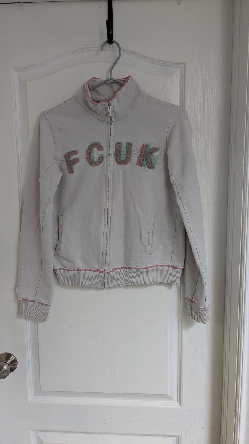 15Selling a jacket from FCUK. It's in great condition and has a zipper. It's a light colour with the brand name written across the front. if the ad is still up it's available