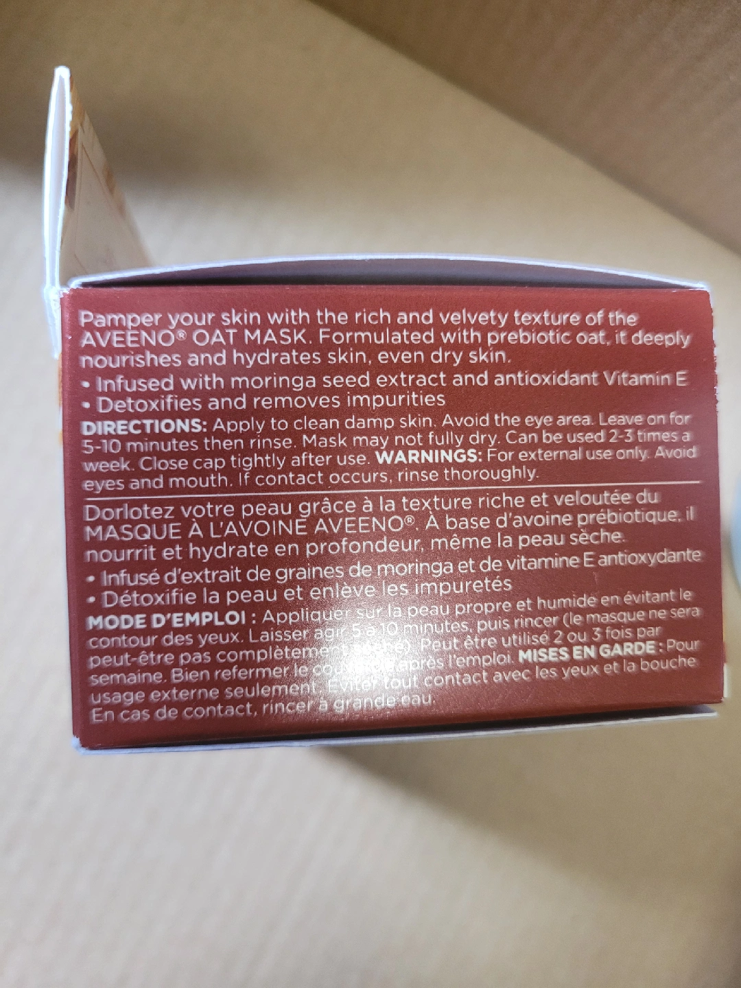 I'm selling a brand new Aveeno Masque à L'avoine (Oat Mask)! It's infused with moringa seed extract and antioxidant Vitamin E. It detoxifies and removes impurities. Pamper your skin with its rich and velvety texture!