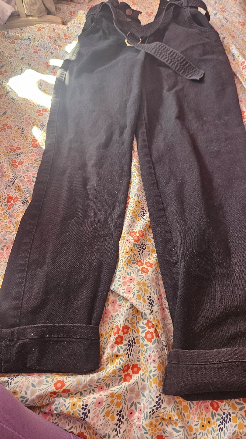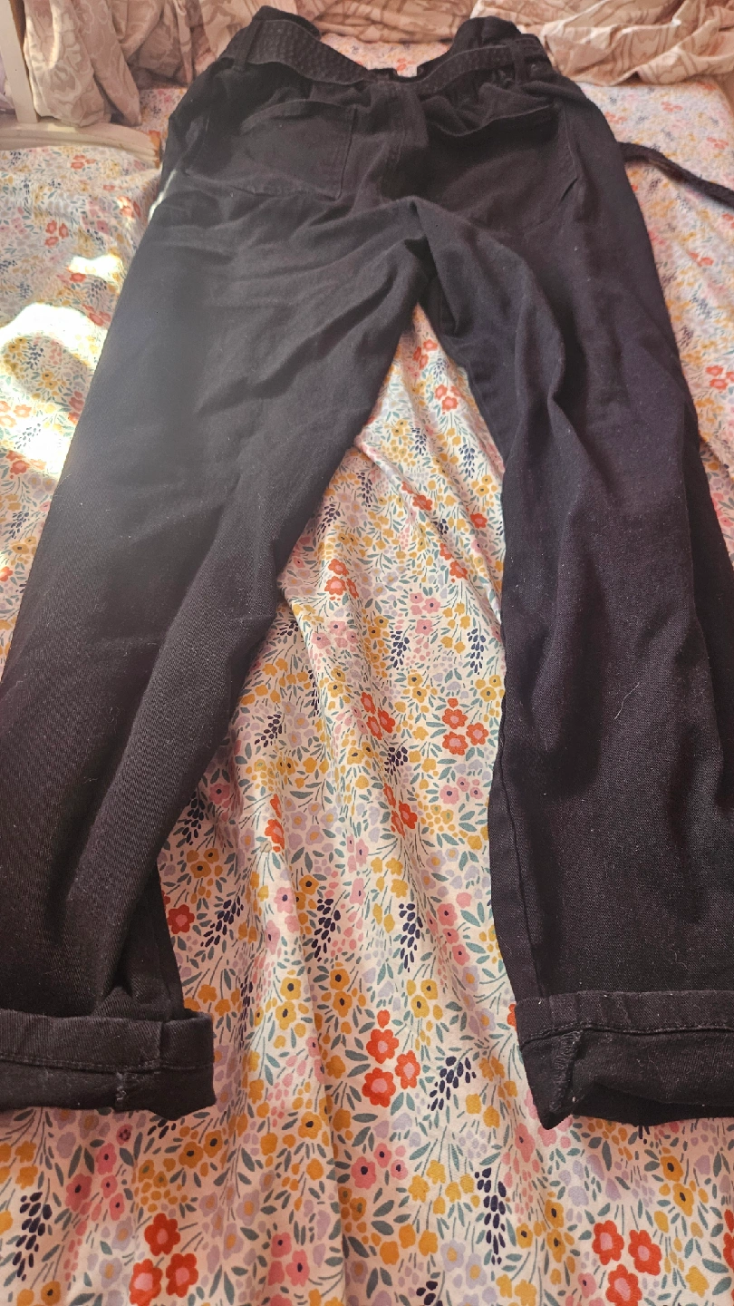 Black denim pants with a matching belt. They're in great condition and ready for a new home! The belt has a circular buckle.