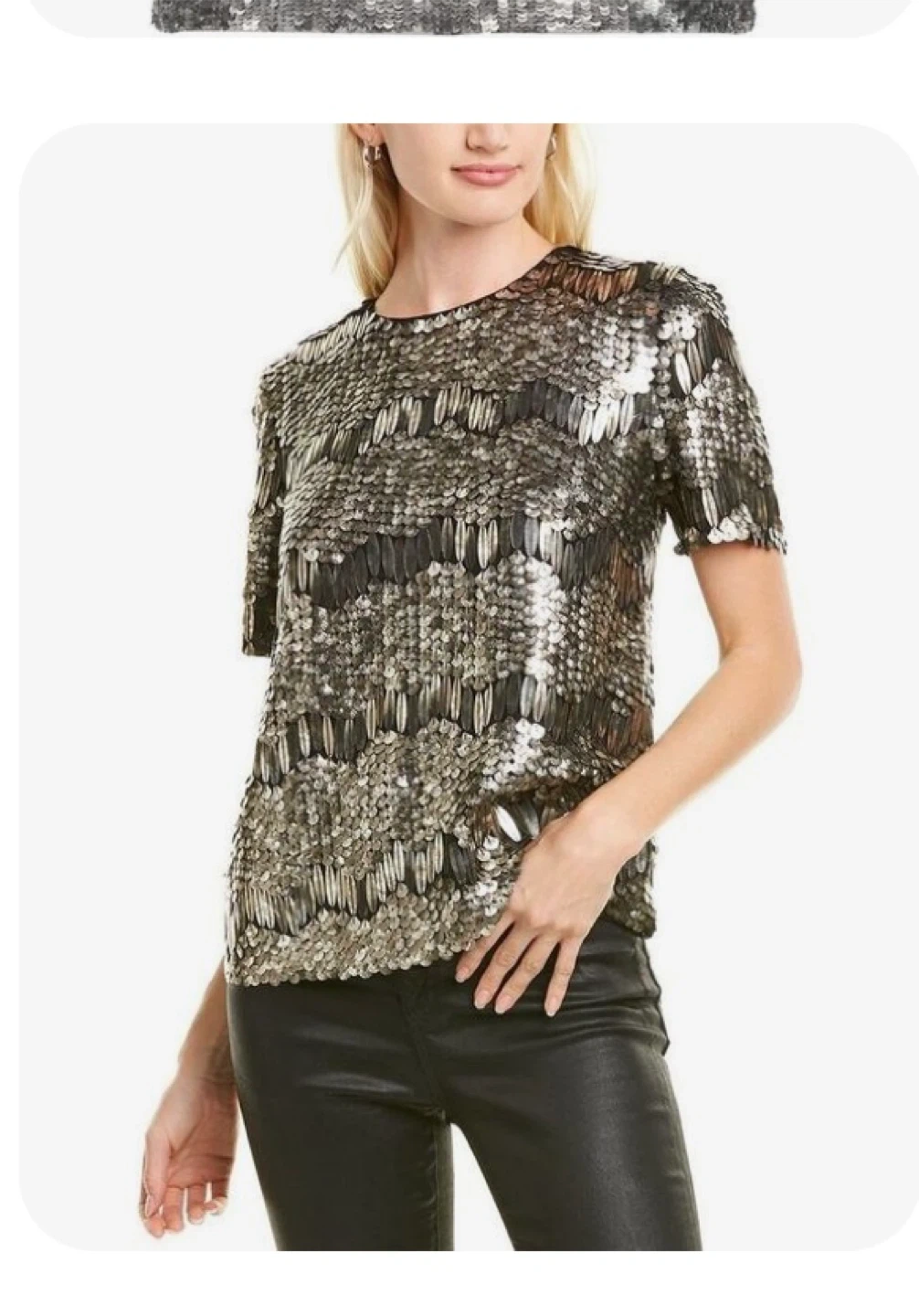 This is a Black sequin-embellished top in size small. The top features a unique design with sequins, making it a stylish choice for any occasion. It's in great condition and ready to wear!