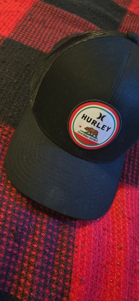 Selling a black Hurley trucker hat featuring the California Republic logo. It's in great shape and ready for a new home! The hat is made of 60% cotton and 40% polyester.
