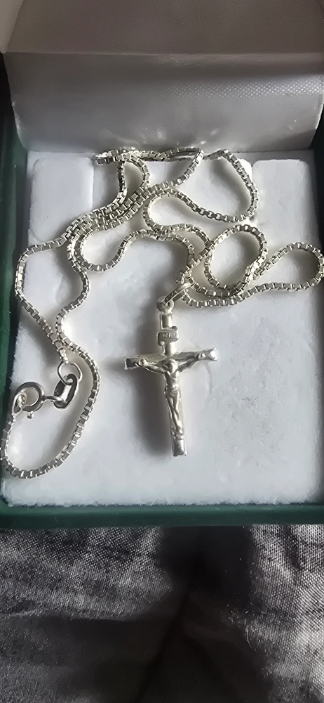 Here's a lovely white gold cross pendant necklace. Barley worn. The chain is a box-style chain and the pendant is a crucifix.