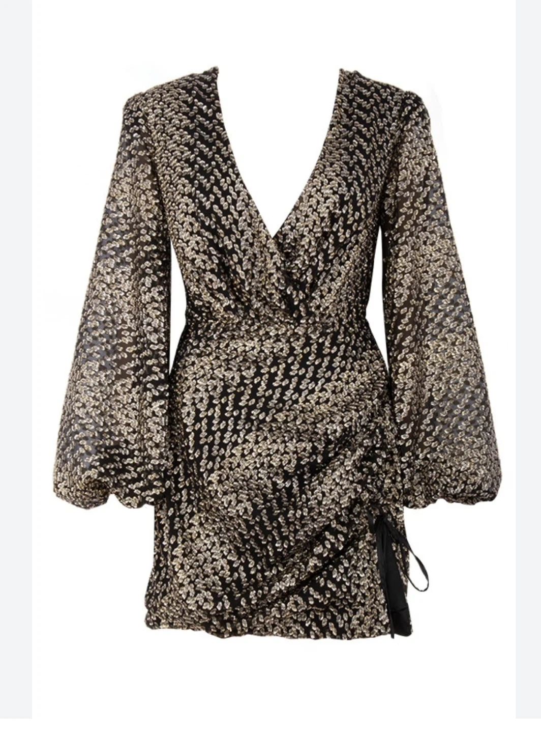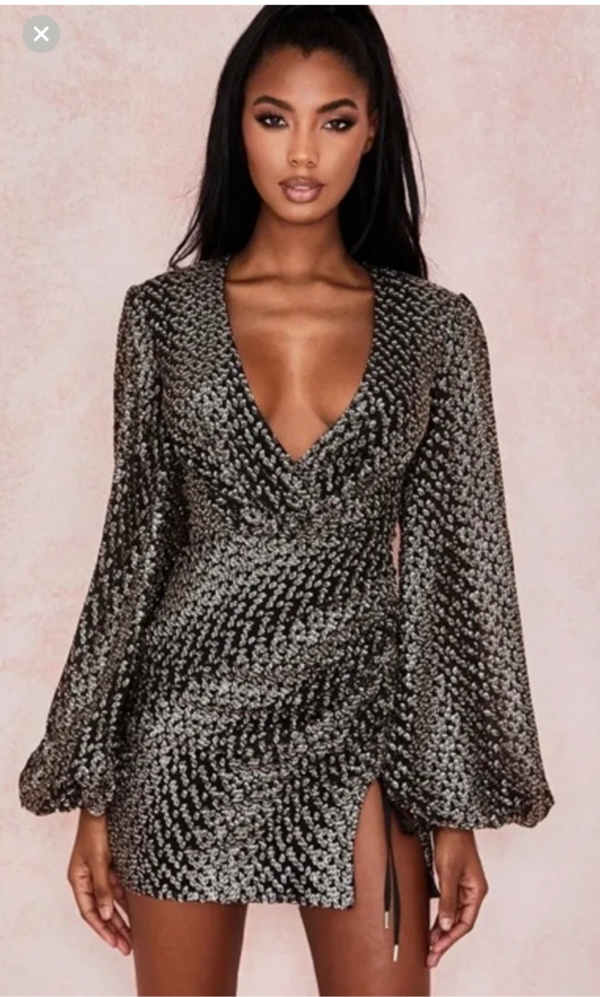 This House of CB dress is perfect for a night out! It features a flattering wrap style with long sleeves and a mini length. The black and gold pattern adds a touch of sparkle