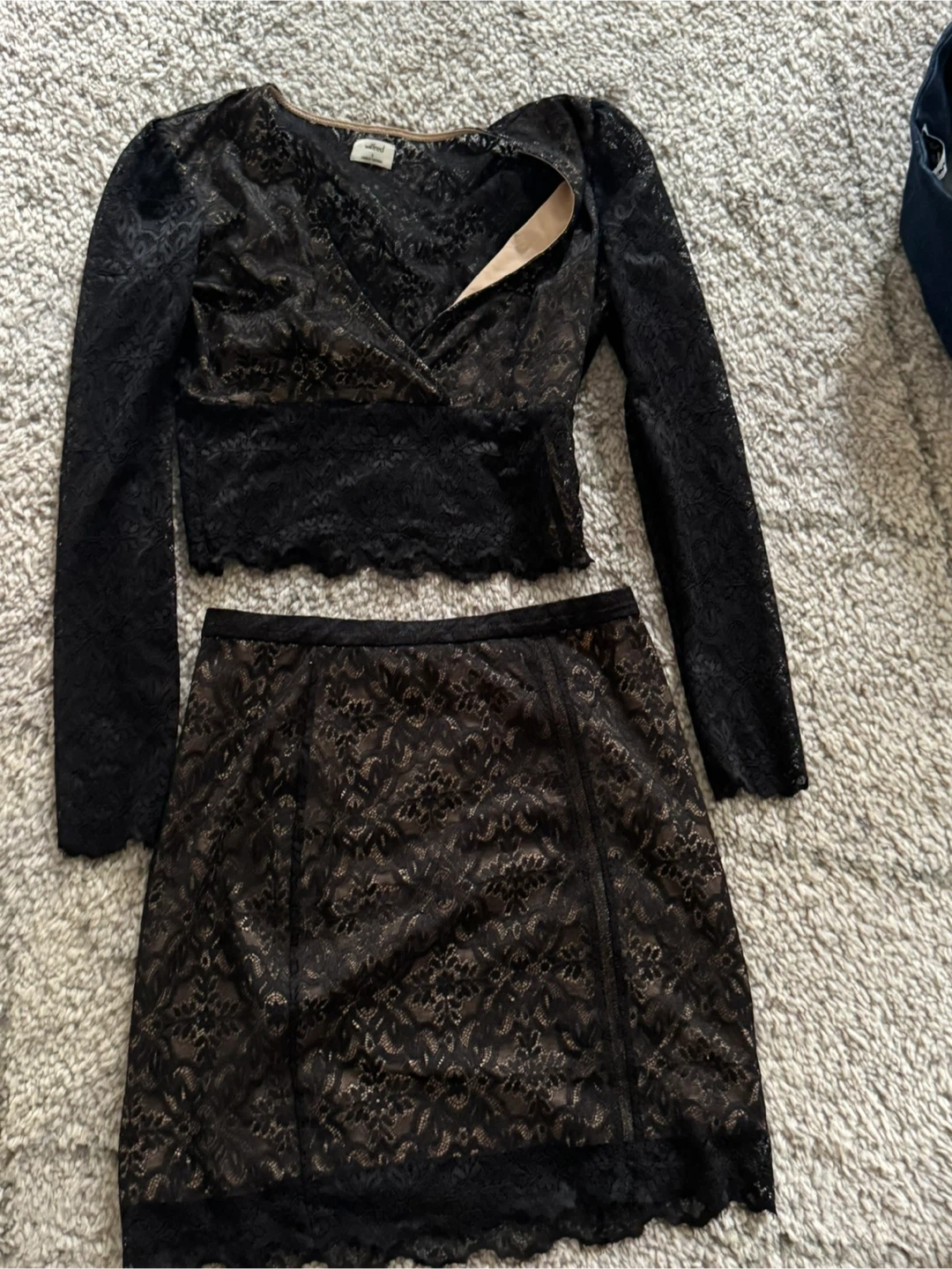 Selling a cute Wilfred Free two-piece set from Aritzia! It features a long-sleeve crop top and a mini skirt, both in a beautiful black lace pattern. Perfect for a night out! Worn once