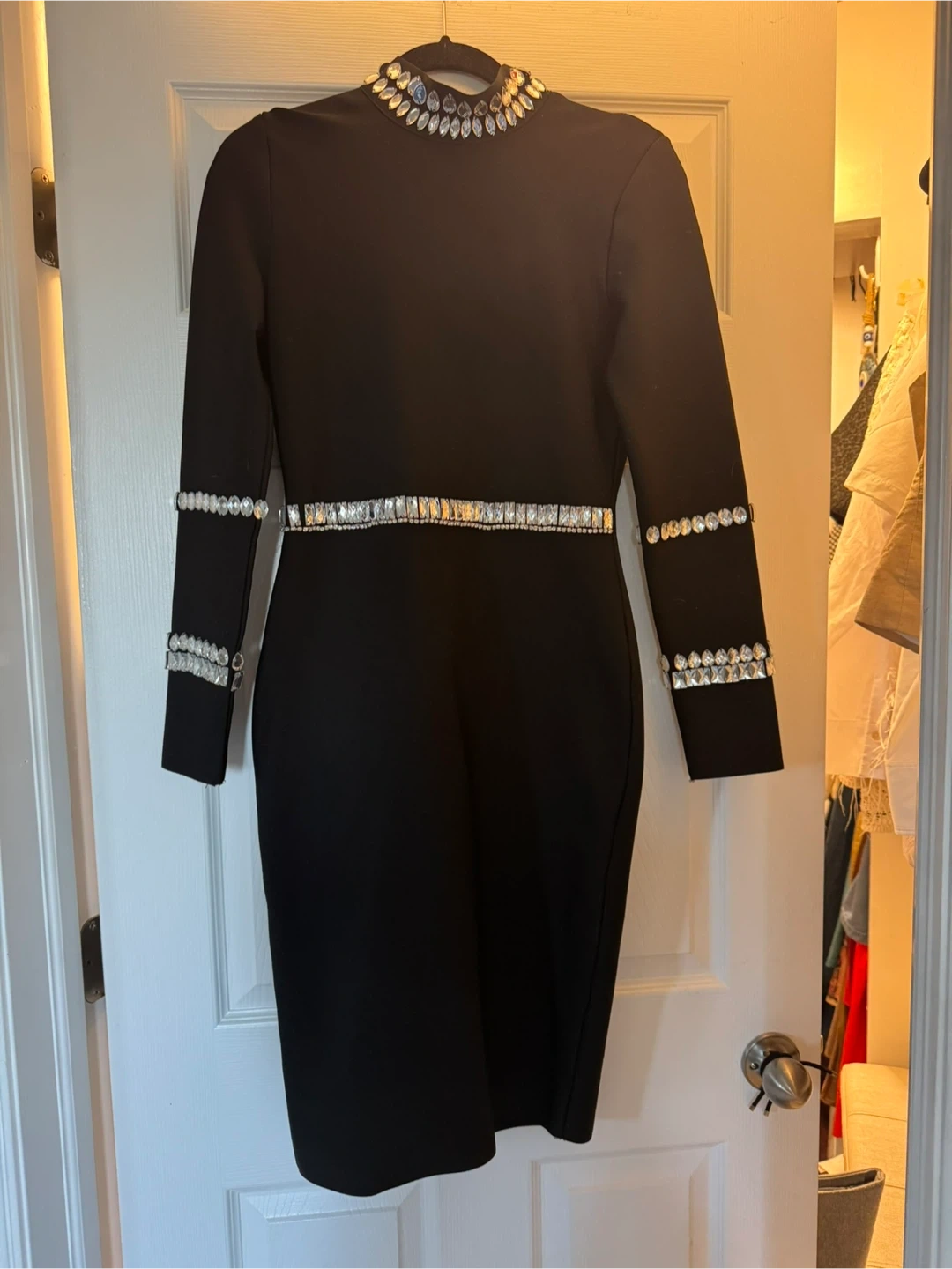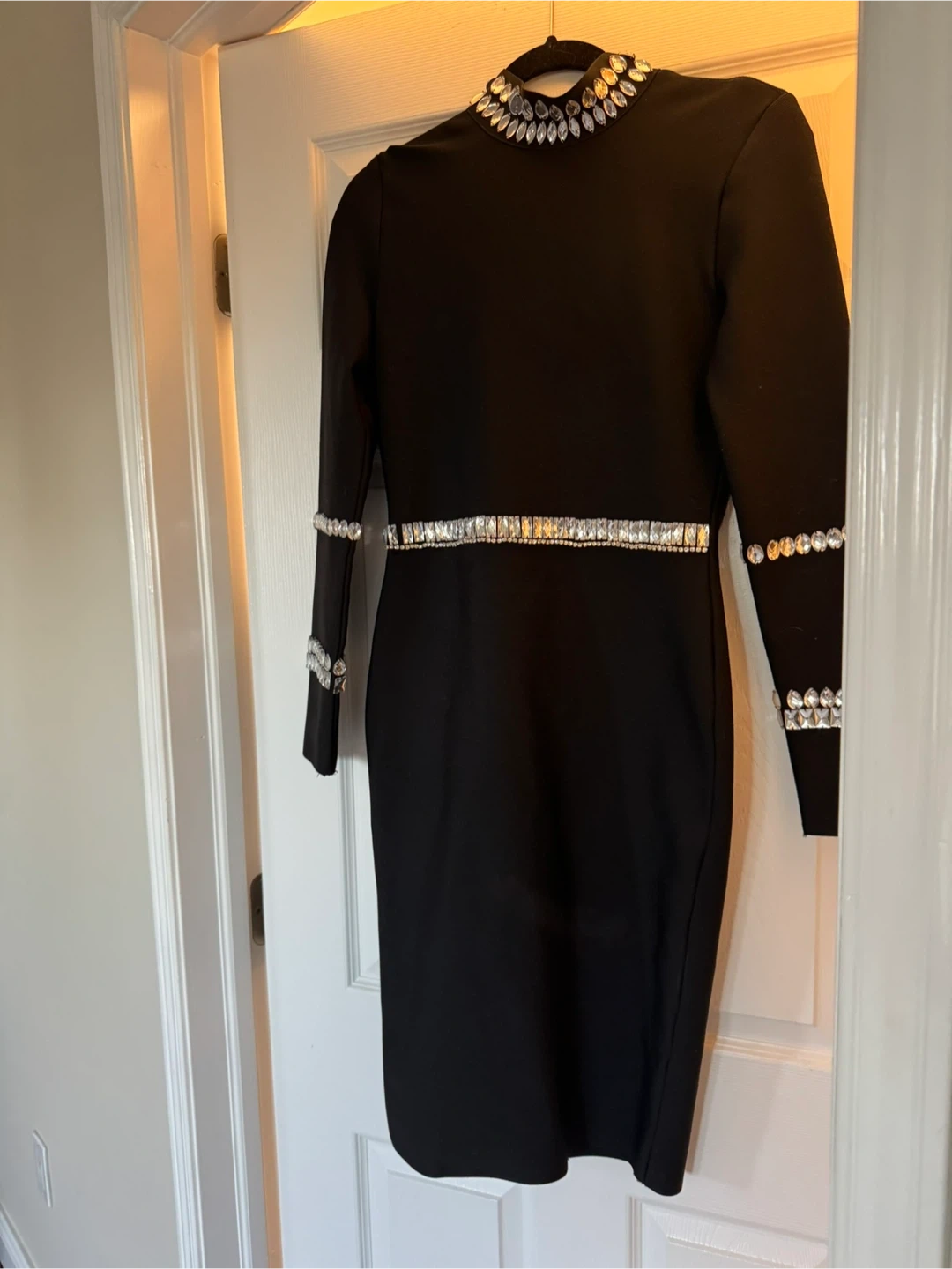 Selling a stylish black long-sleeve dress with beautiful embellishments around the collar, waist, and sleeves! It's in great condition and perfect for a night out or a special occasion! The dress has a sleek and flattering fit