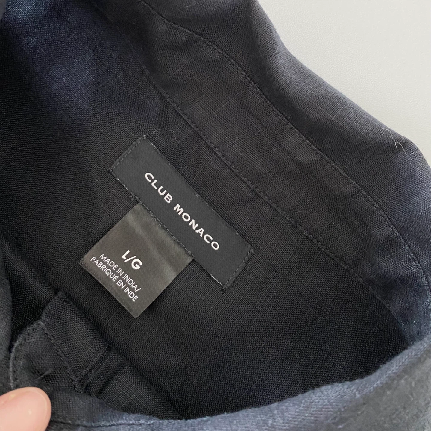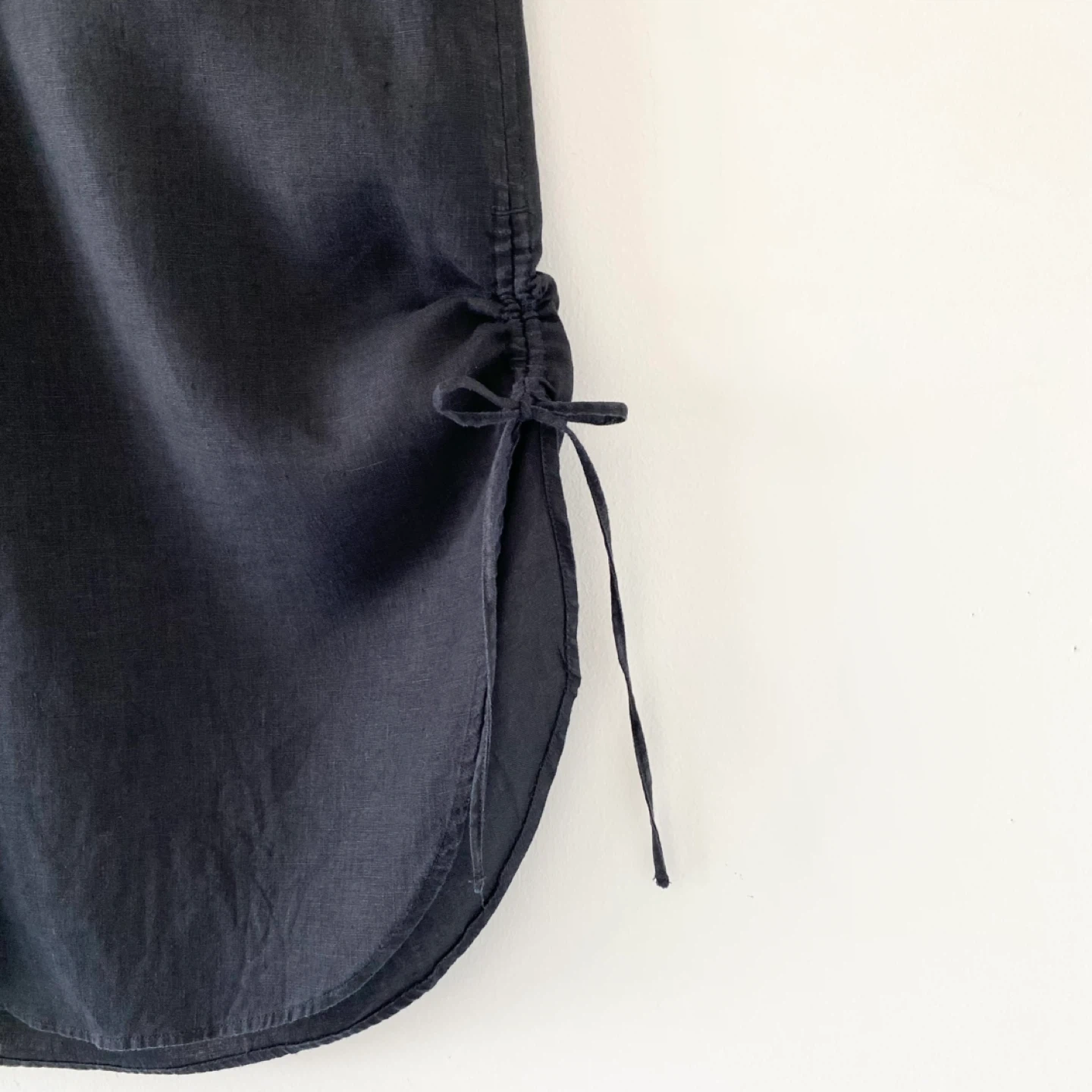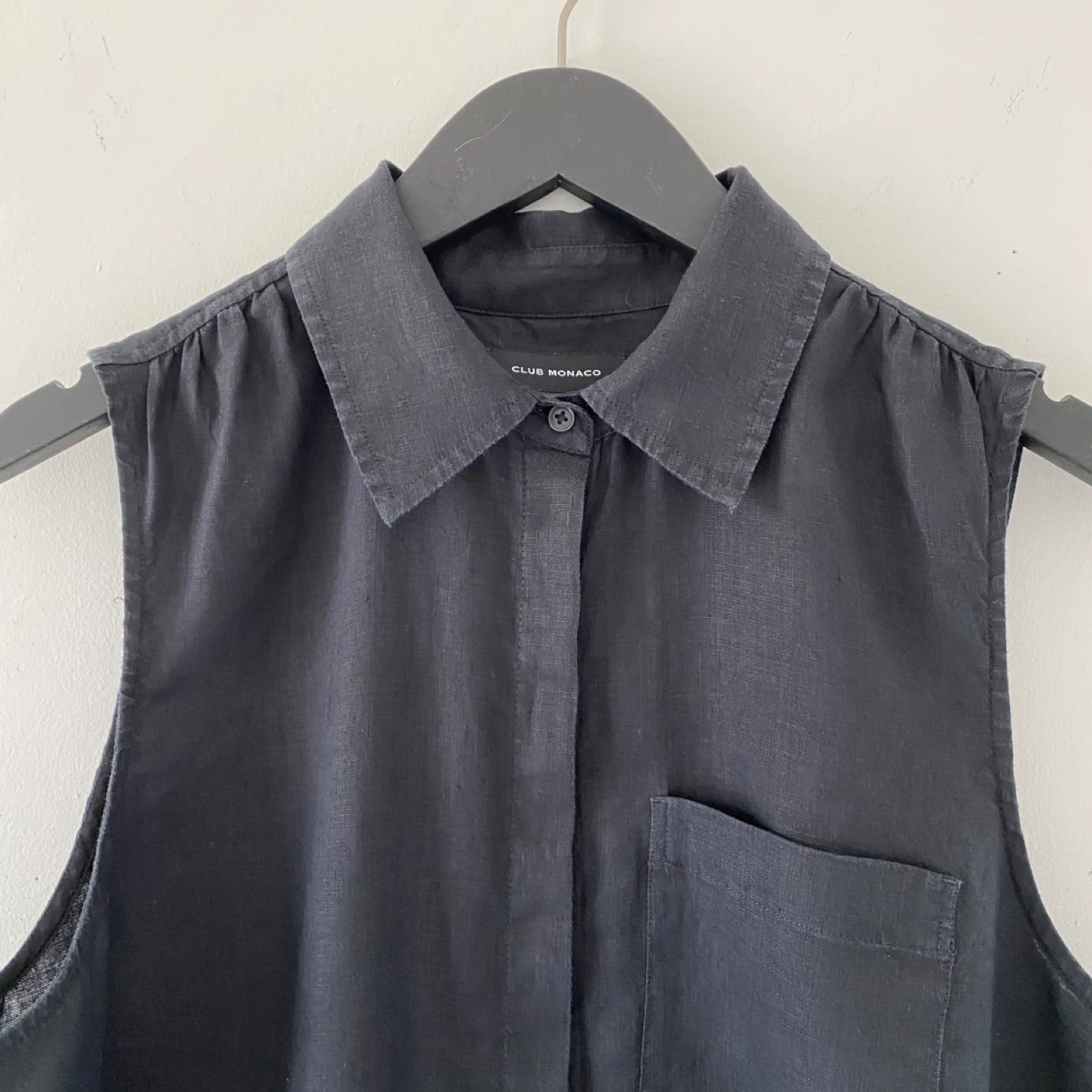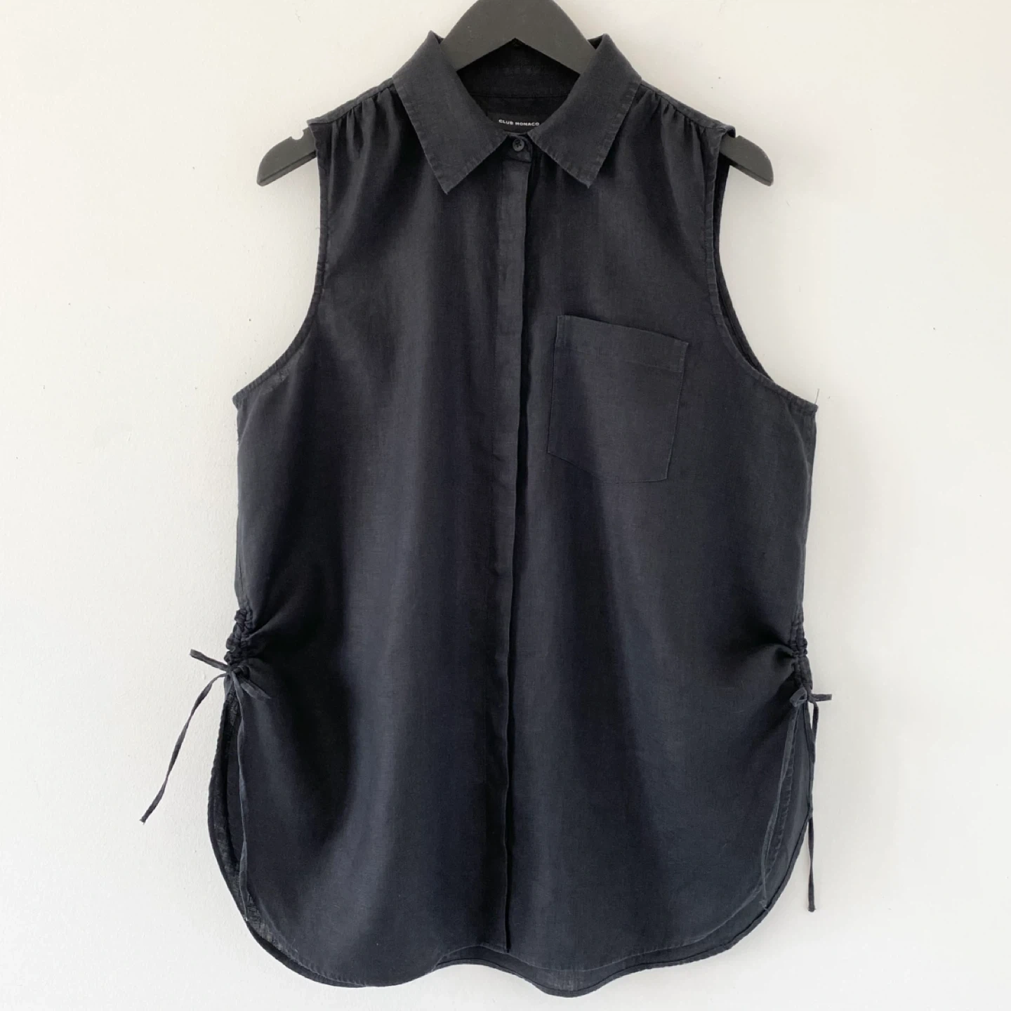 Club Monaco sleeveless blouse with curved hem and side seam adjustable string to create rushing. Made of lightweight 100% linen in black. It's breezy, crisp and drapes beautifully. There's no staining or damage. It's clean and in excellent condition.