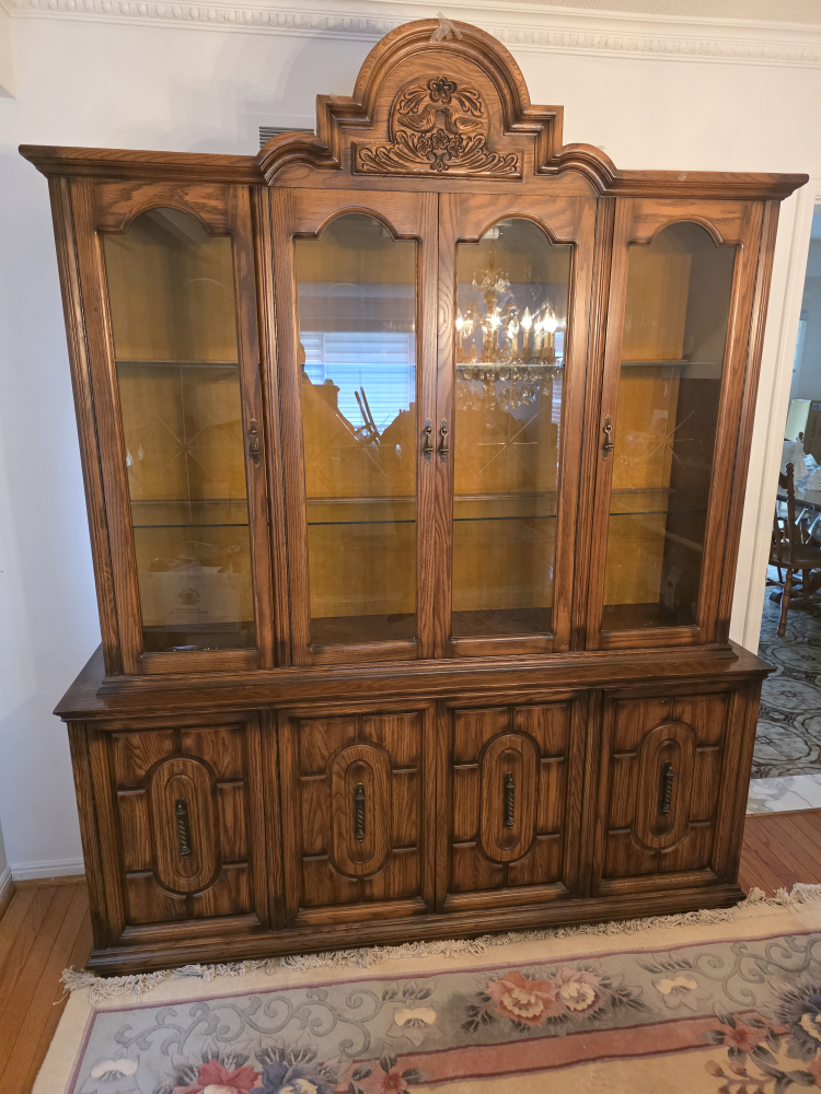 Here's a beautiful wooden china cabinet! It offers ample storage and display space. The wood has a lovely finish. It's a great addition to any dining room or living area!