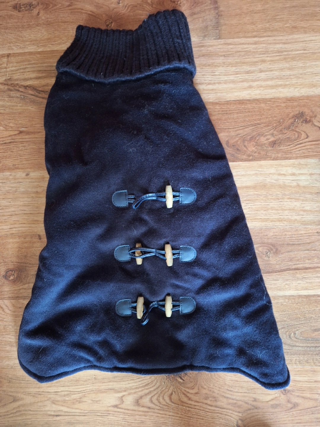 Selling a cozy navy blue dog coat! It's in good condition and will keep your furry friend warm during the colder months. Features a snug fit and stylish toggle closures. Size L