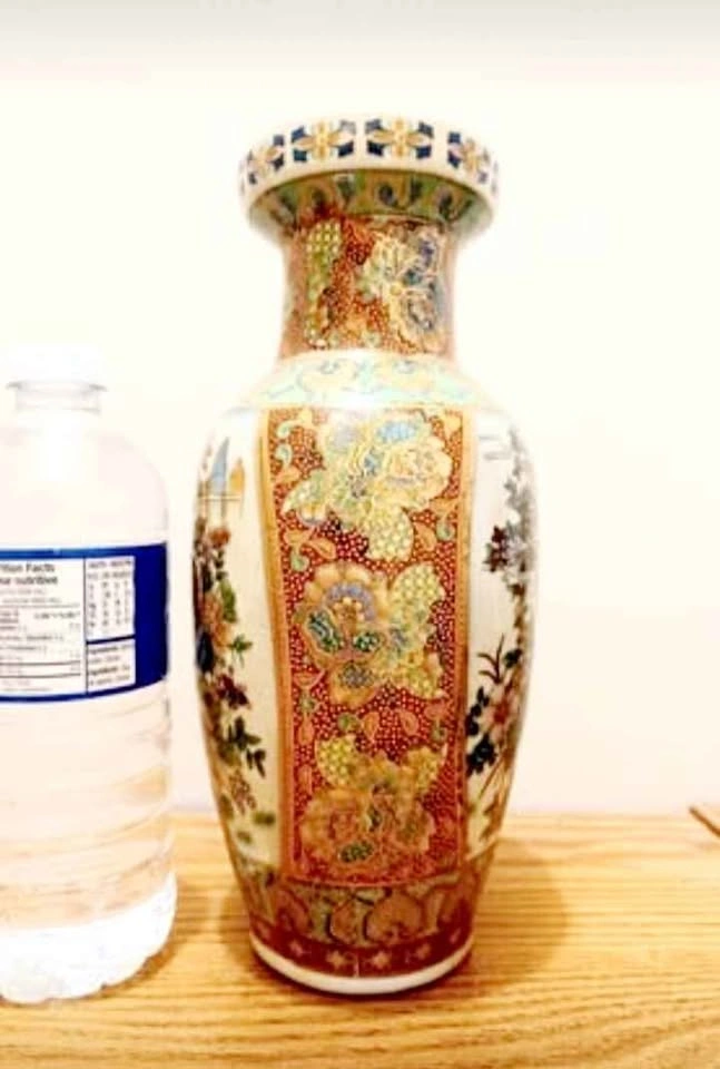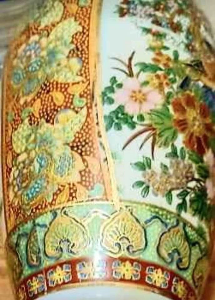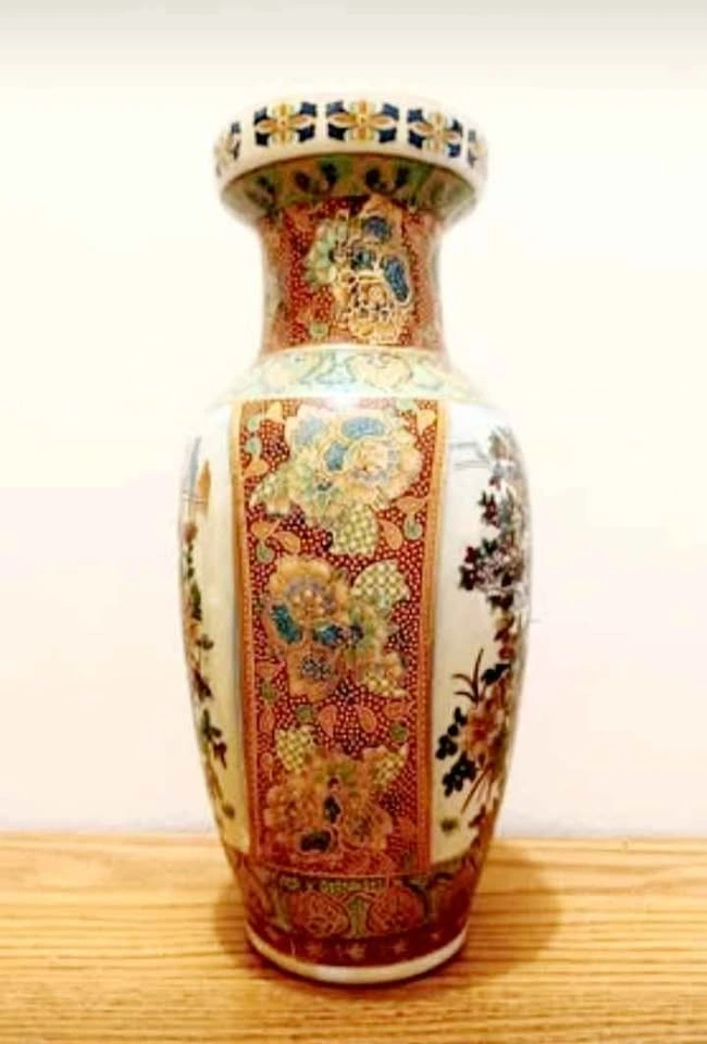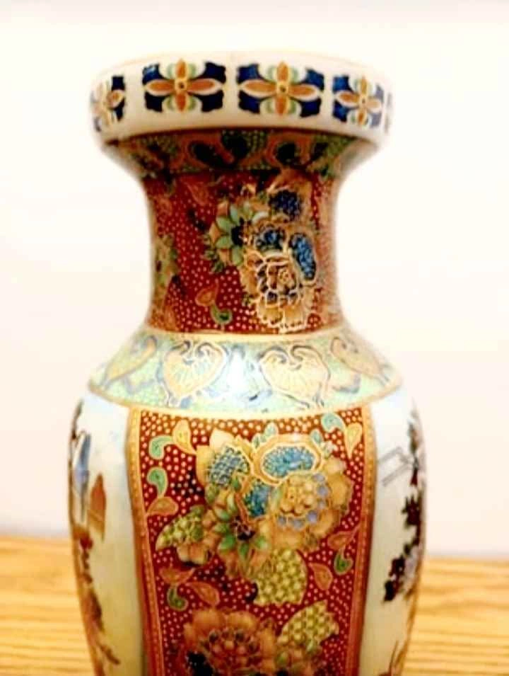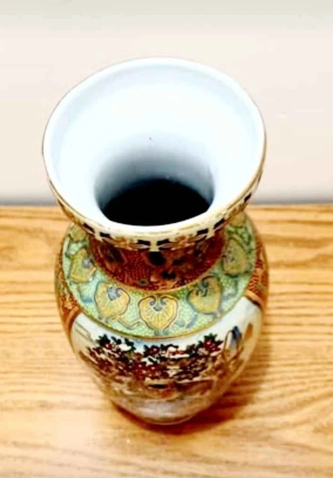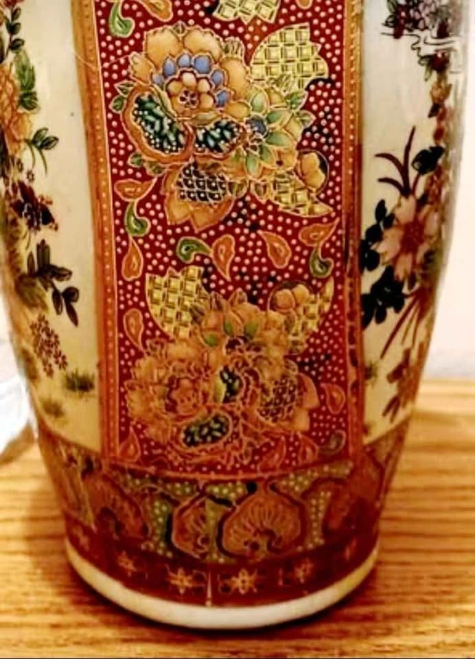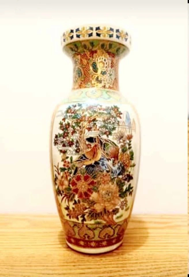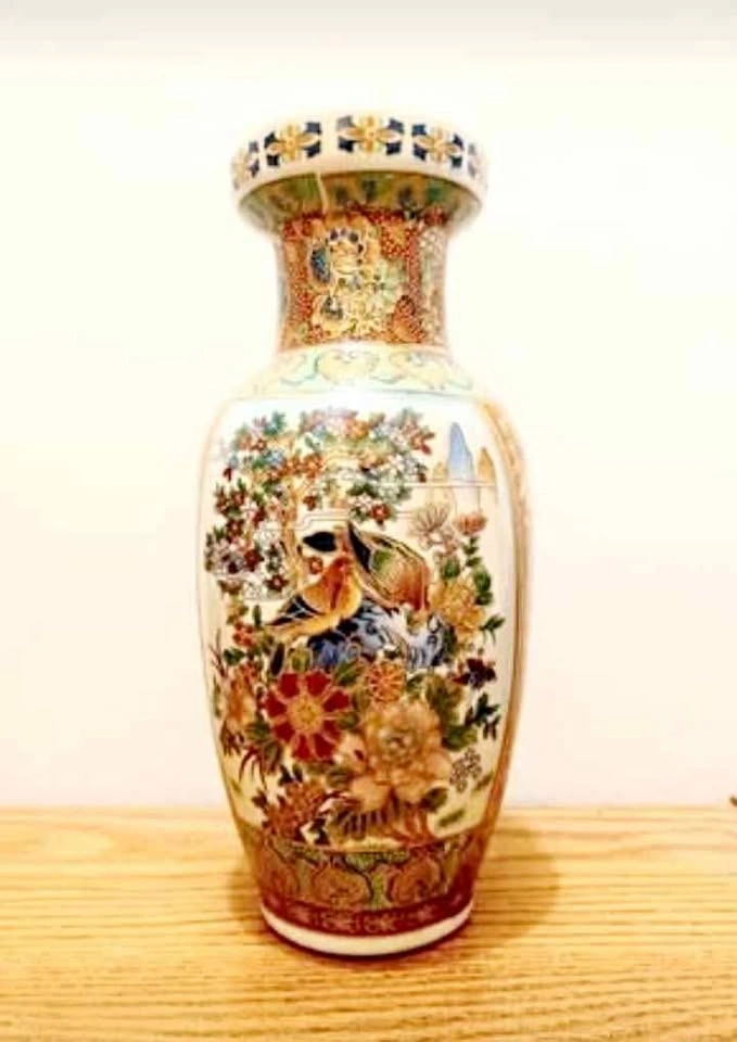 Vintage, Hand-painted Satsuma Porcelain Vase. Detailed, hand-painted scenes and gold accents. Birds and floral motifs.