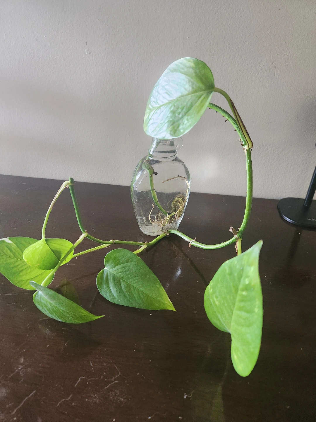 pothos plant cutting in a small glass vase. It's actively growing roots and is ready to be planted in soil or kept in water. A great way to easily add some greenery to your space