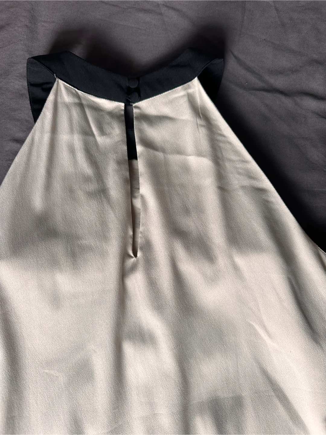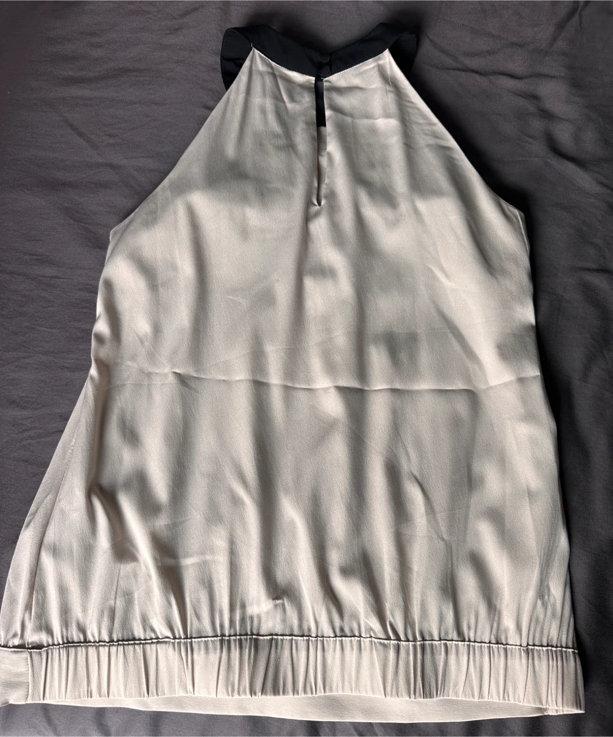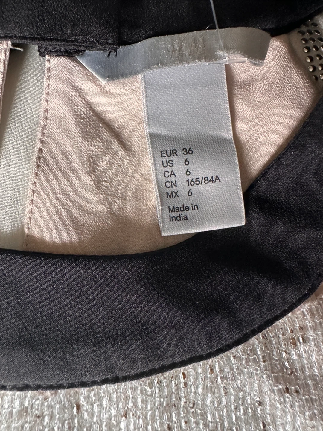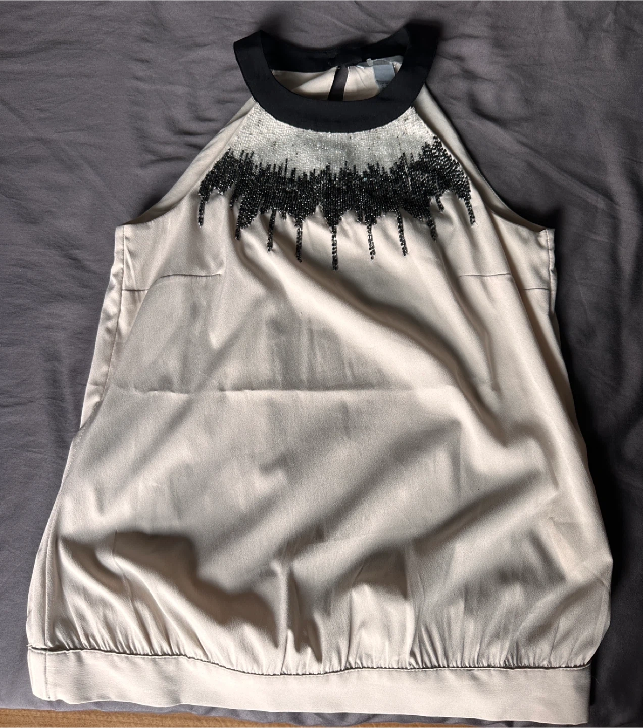 Selling a super cute H&M halter top featuring a black collar and beaded detailing on the front. The size is US 6. Never worn.