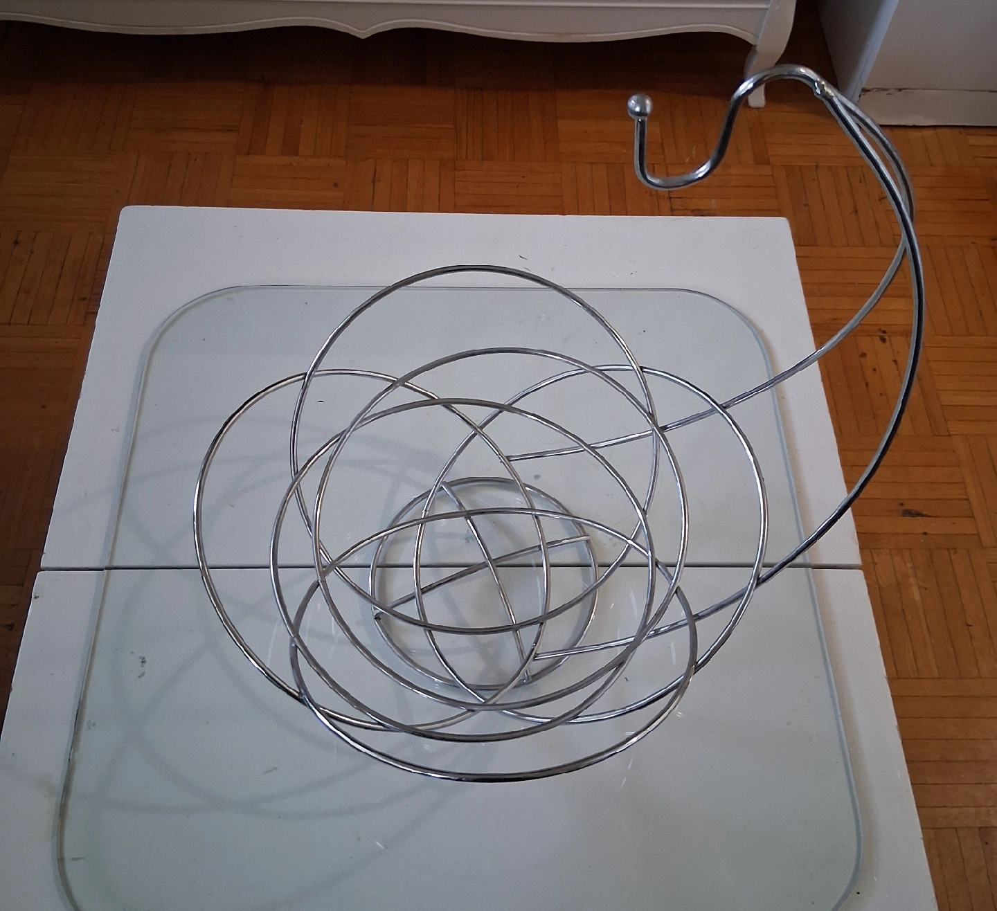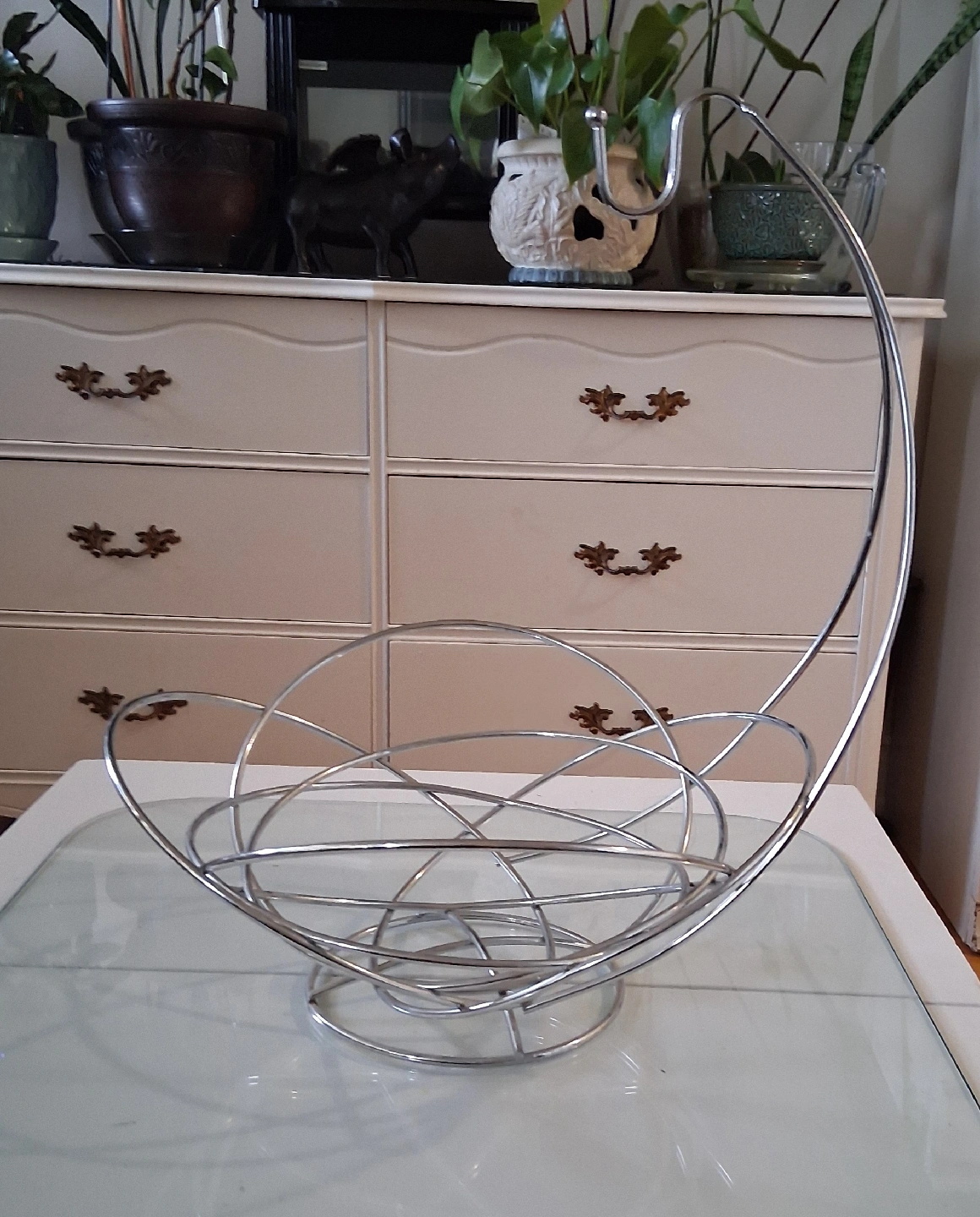 Here's a stylish chrome fruit basket with a handy banana hook! It's a great way to display your fruit while keeping bananas from bruising. This basket is in great shape and ready to add a touch of modern flair to your kitchen or dining area