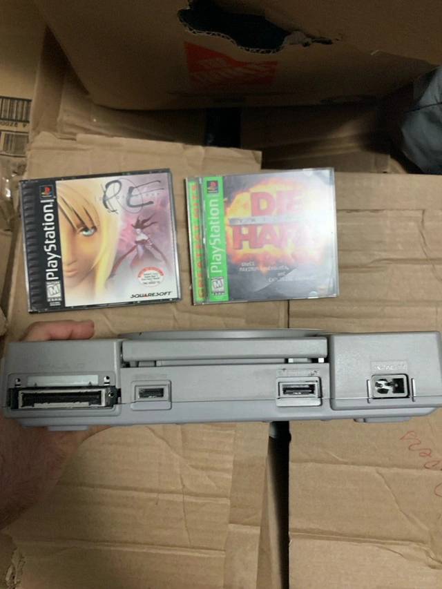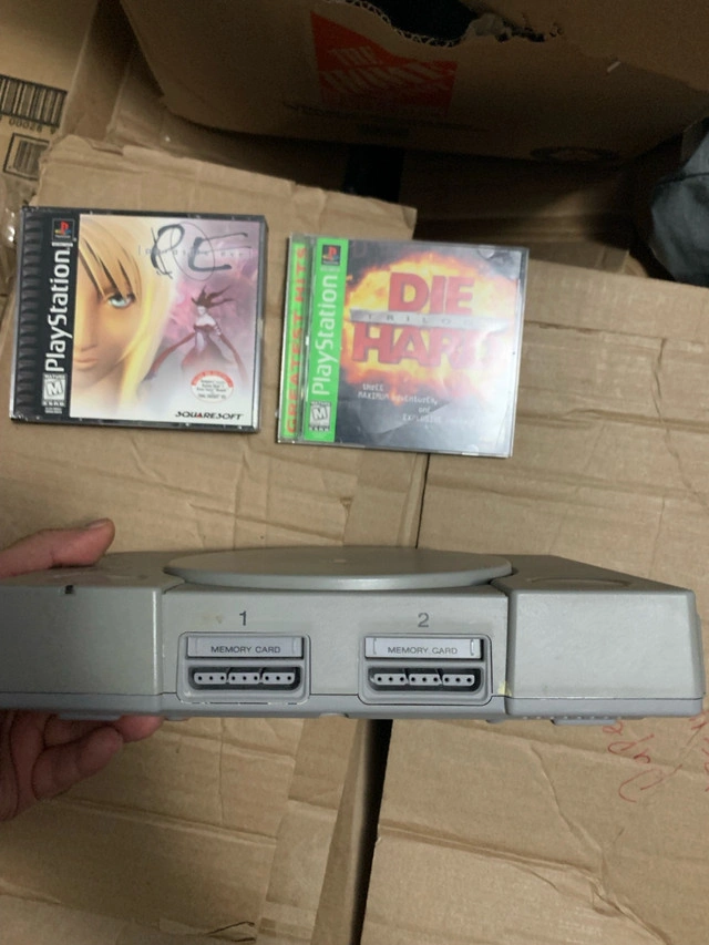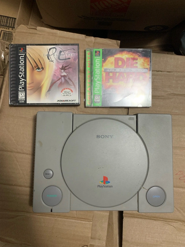 22Dive into retro gaming with this used Sony PlayStation console, complete with two classic games: Parasite Eve and Die Hard Trilogy. The console is in good working condition, ready to bring back those nostalgic gaming memories. A must-have for collectors and retro gaming enthusiasts! - Parasite eve is in its original box with disc 2 ONLY and No Instruction Manual - No cables included, just the console, games and the two middle controllers in the second picture Own a piece of gaming history—it's your turn to press start! If the ad's up, the PlayStation is ready to level up your collection.