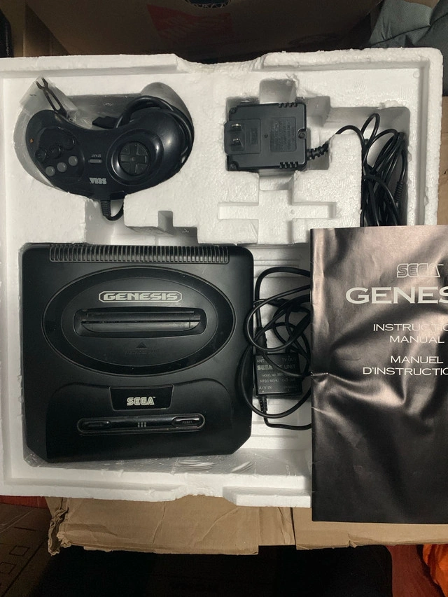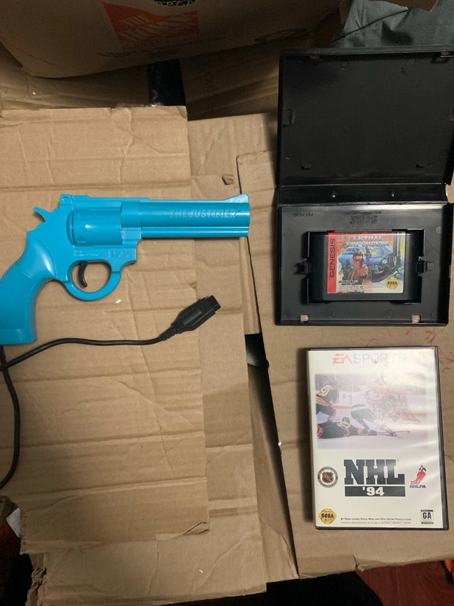 Relive the golden age of gaming with this Sega Genesis console, complete with its original box! This vintage system is in used condition. The console comes with one controller, the original power supply, and AV cable, along with the instruction manual. Also included is a Justifier light gun and two games - NHL '94 and Lethal Enforcers. *Rare* - all original items including box, manual, controller for console If the ad's up, it's up for grabs!