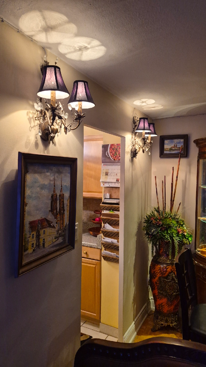 82Here's 4 charming wall sconce that would add a touch of elegance to any room! they features dark shades and decorative metalwork with crystal accents. Perfect for creating a warm and inviting atmosphere in your home. $25 each